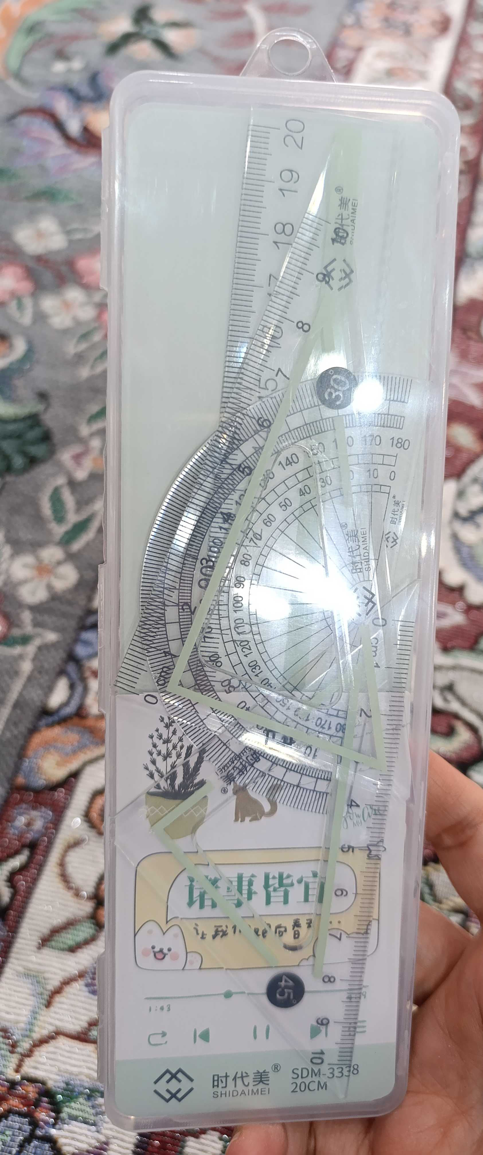 ست خط کش نقاله وگونیاکه شامل دوتاگونیا هست یه نقاله ویه خط کش تو باکس هست.