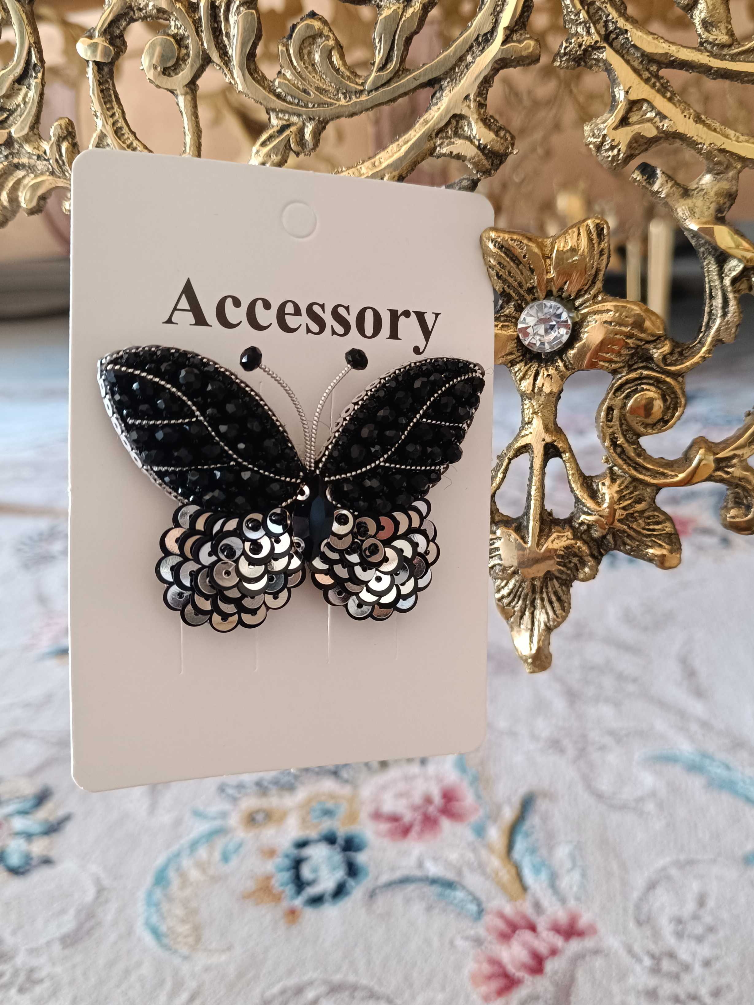 سنجاق سینه جواهردوزی شده پروانه مشکی قابل سفارش در رنگ و طرح دلخواه مناسب برای آویز کیف،سنجاق لباس و شومیز،سنجاق پالتو و مانتو و..