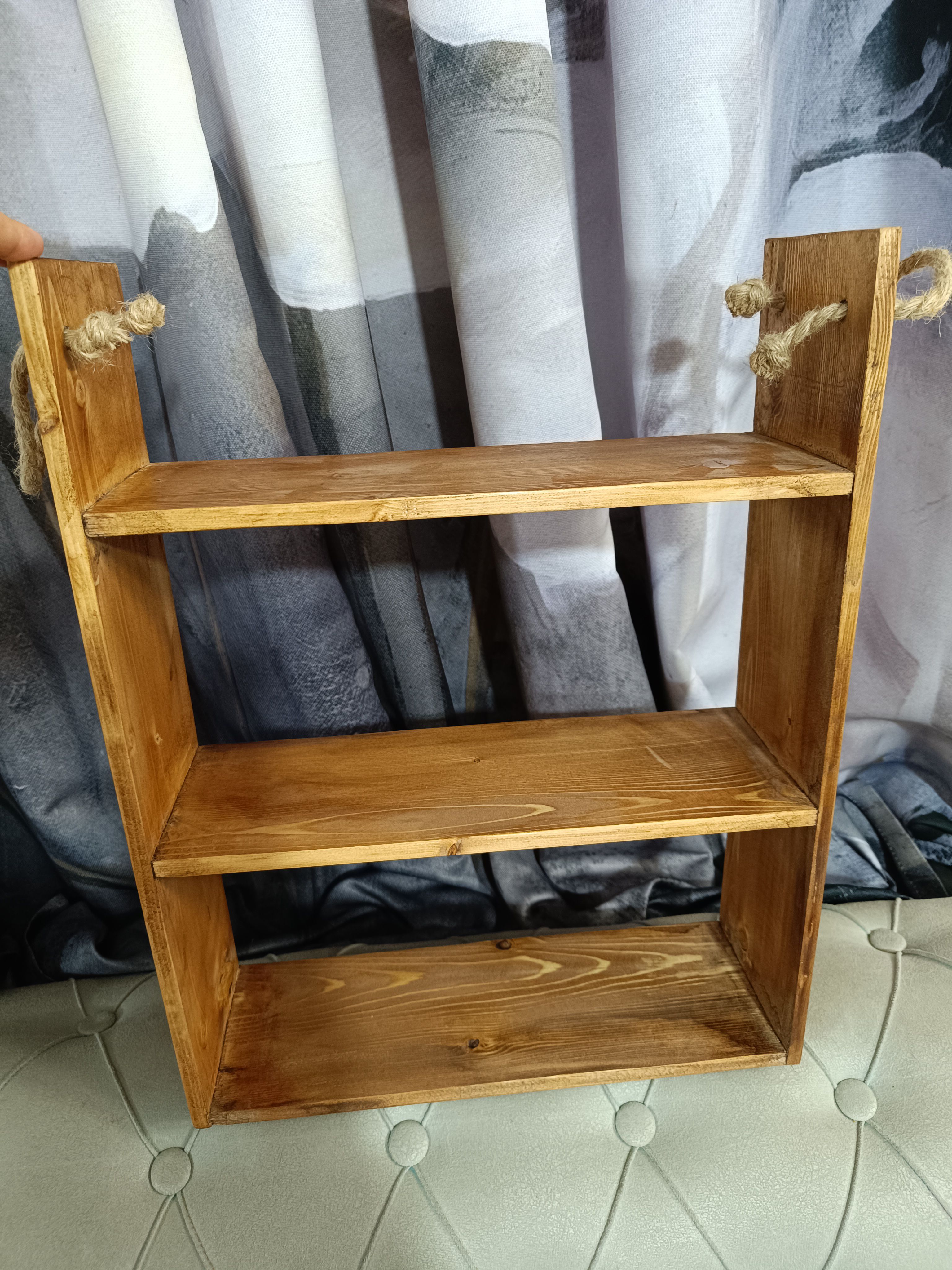 شلف چوبی سه طبقه . هم میتوان به عنوان شلف رو میزی و شلف دیواری استفاده شود. جنس چوب نراد روسی وارداتی هستش. شلف با توجه به ضخامت زیاد طبقات تحمل وزن سنگین را دارد. ضخامت 1/6سانتی متر طول آن 46و عرض آن 36سانتی متر است.