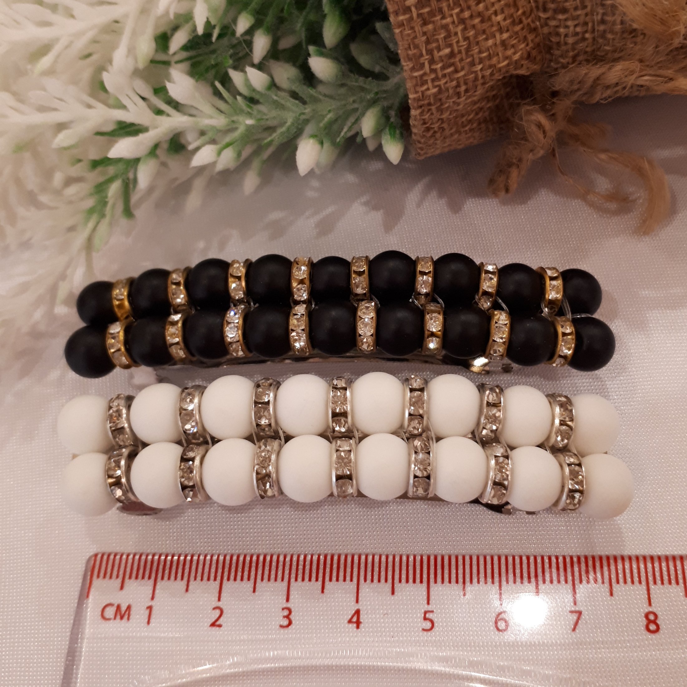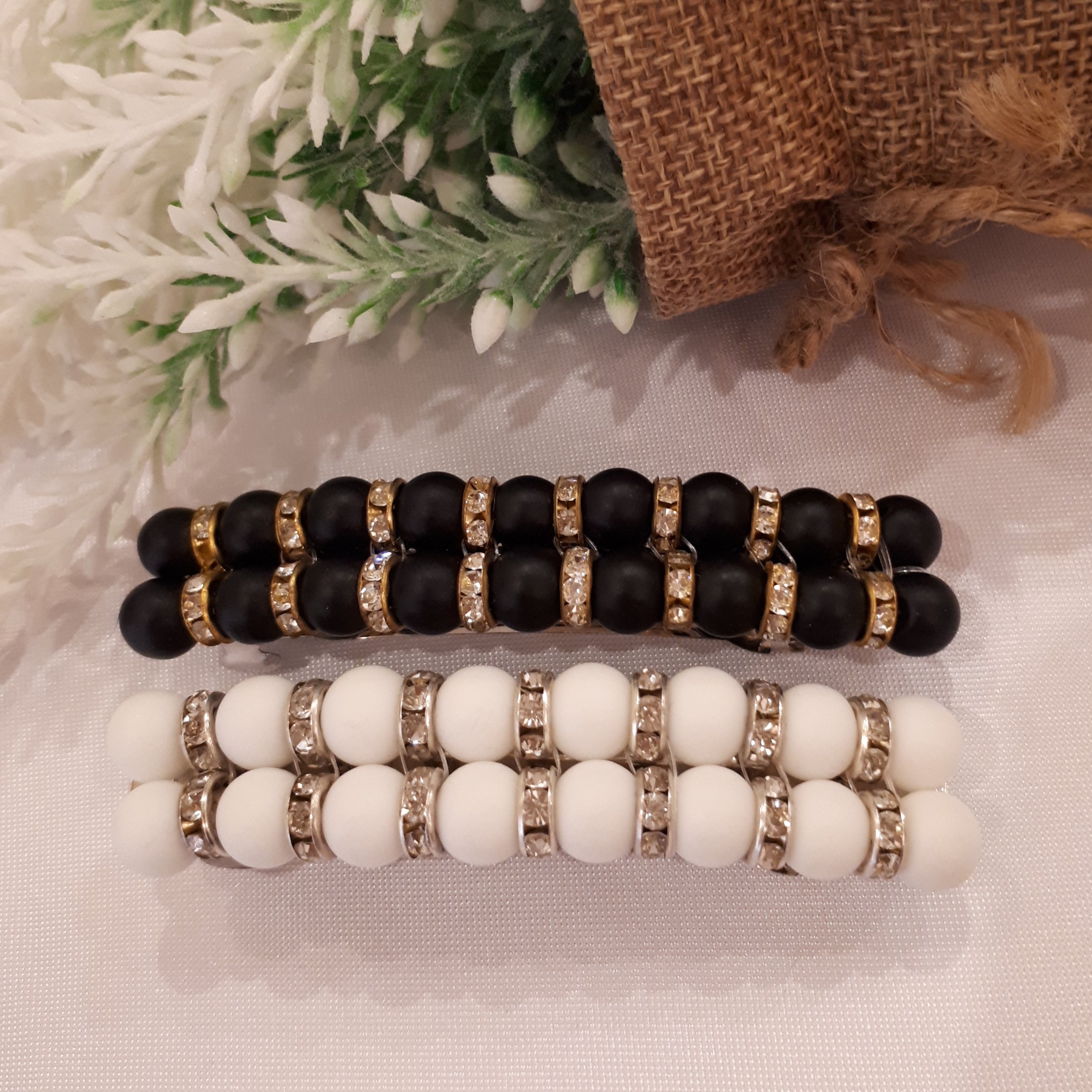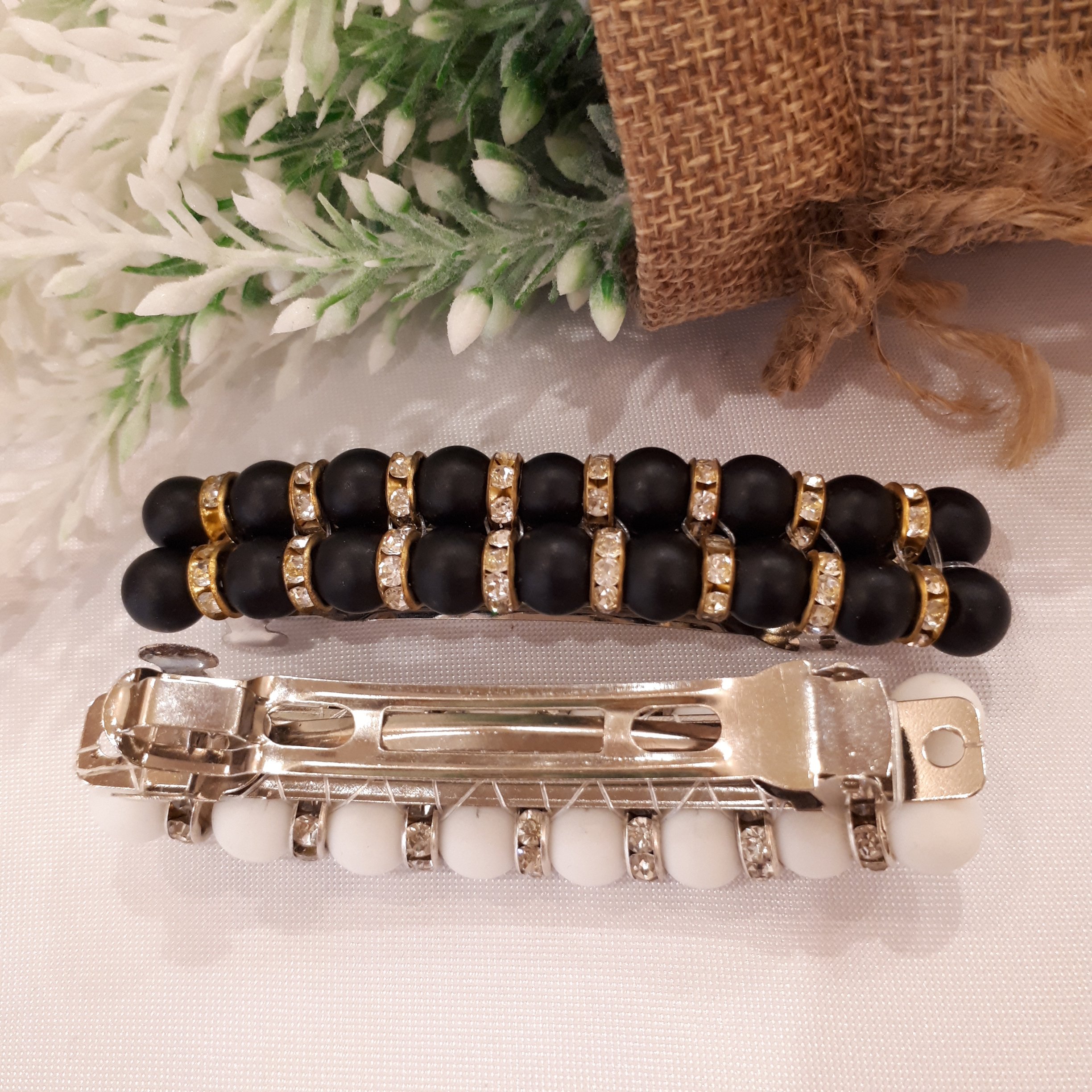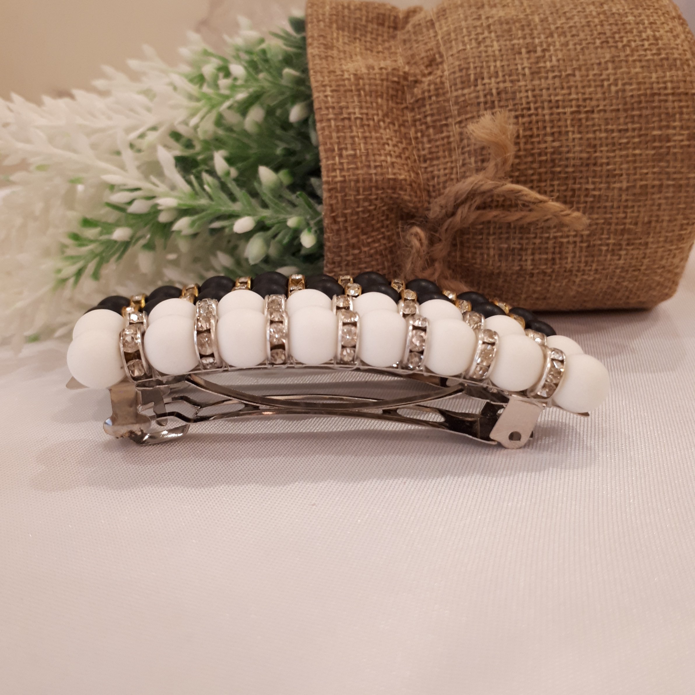 گیره مو مجلسی دستساز خانگی در دو رنگ سفید وسیاه با مهره های نگین دار با گیره استیل فرانسوی بافته شده با نخ نامرئی کاملا سفت ومحکم