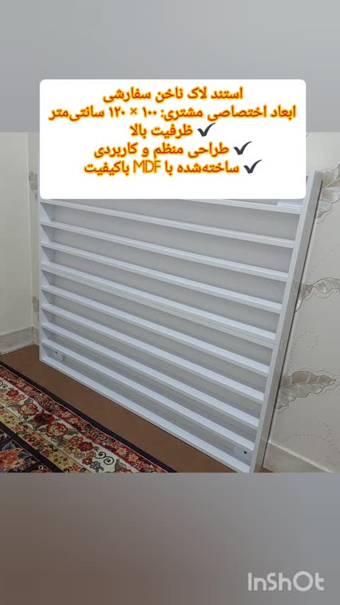 ✨ استند دیواری لاک ناخن MDF درجهیک – 5 طبقه ✨ با این استند لاک دیواری، دیگه خبری از بینظمی روی میز آرایش نیست! ساخته شده از امدیاف مرغوب و باکیفیت تا هم ظاهر شیک و جذاب داشته باشه و هم سالها بدون آسیب بمونه. ✔️ نصب راحت روی دیوار، بدون نیاز به ابزار خاص ✔️ 5 طبقه برای مرتب کردن انواع لاک در سایزها و رنگهای مختلف ✔️ مناسب برای سالنهای زیبایی یا میز آرایش در خانه با این استند، لاکهایت همیشه در دسترس و مرتب خواهند بود 😍 یک انتخاب هوشمندانه و شیک برای خانمهایی که نظم و زیبایی را دوست دارند 💖 استند لاک ناخن دارای ابعاد به طول 44 سانتی متر و عرض 8 سانتی متر و ارتفاع 64 سانتی متر بوده و شامل 5 طبقه با ارتفاع 11 سانتی متر و عمق 8 سانتی متر می باشد و ظرفیت حدودی 150 الی 160 عدد لاک ناخن را داراست