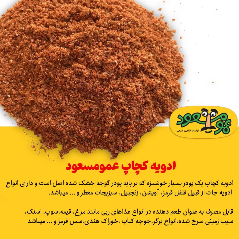 ادویه کچاپ یک پودر بسیار خوشمزه که بر پایه پودر گوجه خشک شده اصل است و دارای انواع ادویه جات از قبیل فلفل قرمز، آویشن، زنجبیل، سبزیجات معطر و ... میباشد. قابل مصرف به عنوان طعم دهنده در انواع غذاهای ربی مانند مرغ، قیمه،سوپ، اسنک، سیب زمینی سرخ شده،انواع برگر،جوجه کباب ،خوراک هندی،سس قرمز و ... میباشد