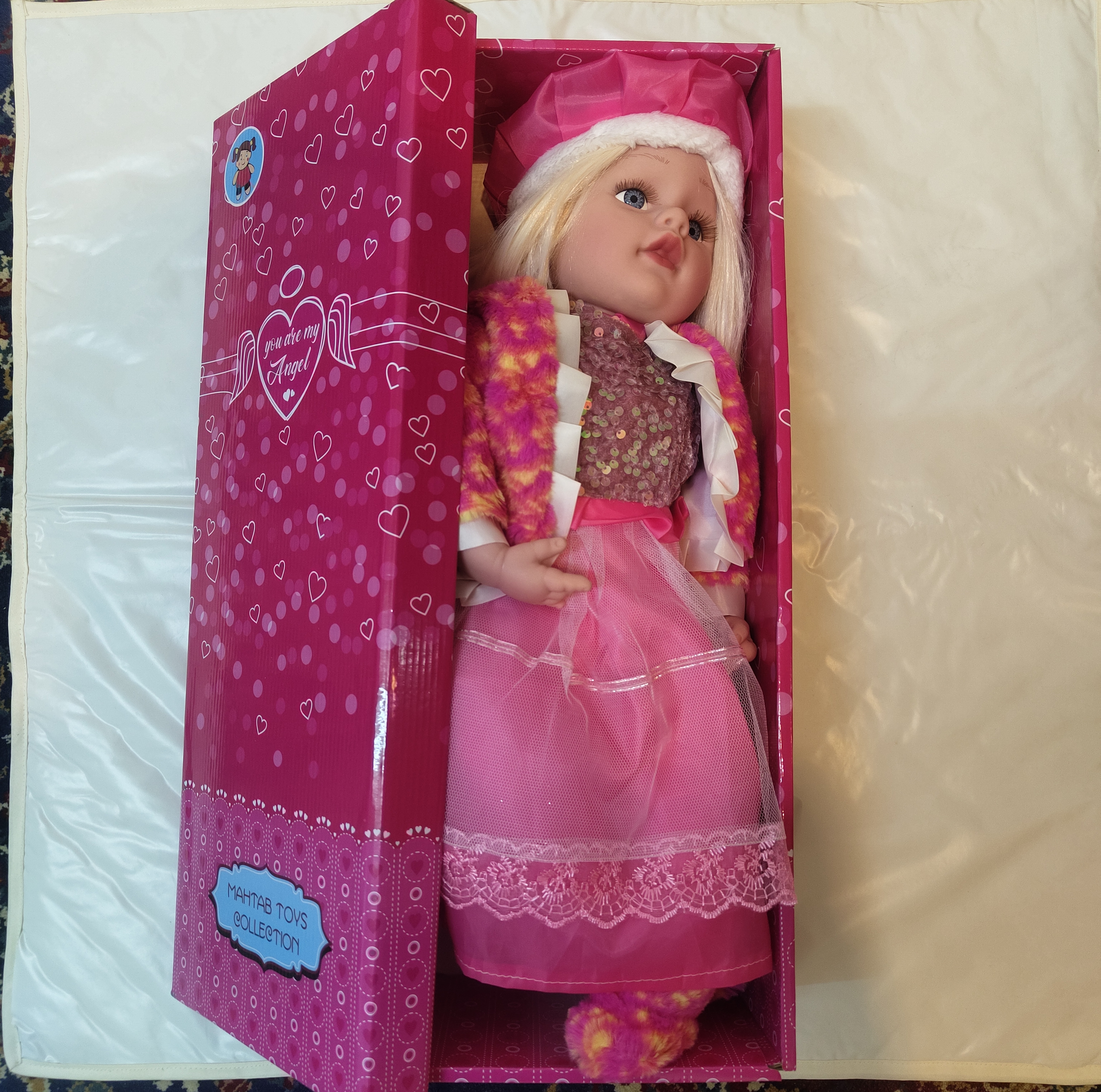 • عروسک طرح سرامیک 24 اینج 3 تا آوازه موزیکال سایز بزرگ قد 60 سانت دست و سرو پا گوشتی تنه پنبه‌ای لباس 4 تیکه پیراهن و کت و کلاه و جوراب موهاش کلاه گیسی قابل شانه زدن چشماش تیله ای و لنزی با جعبه کادویی مناسب هدیه