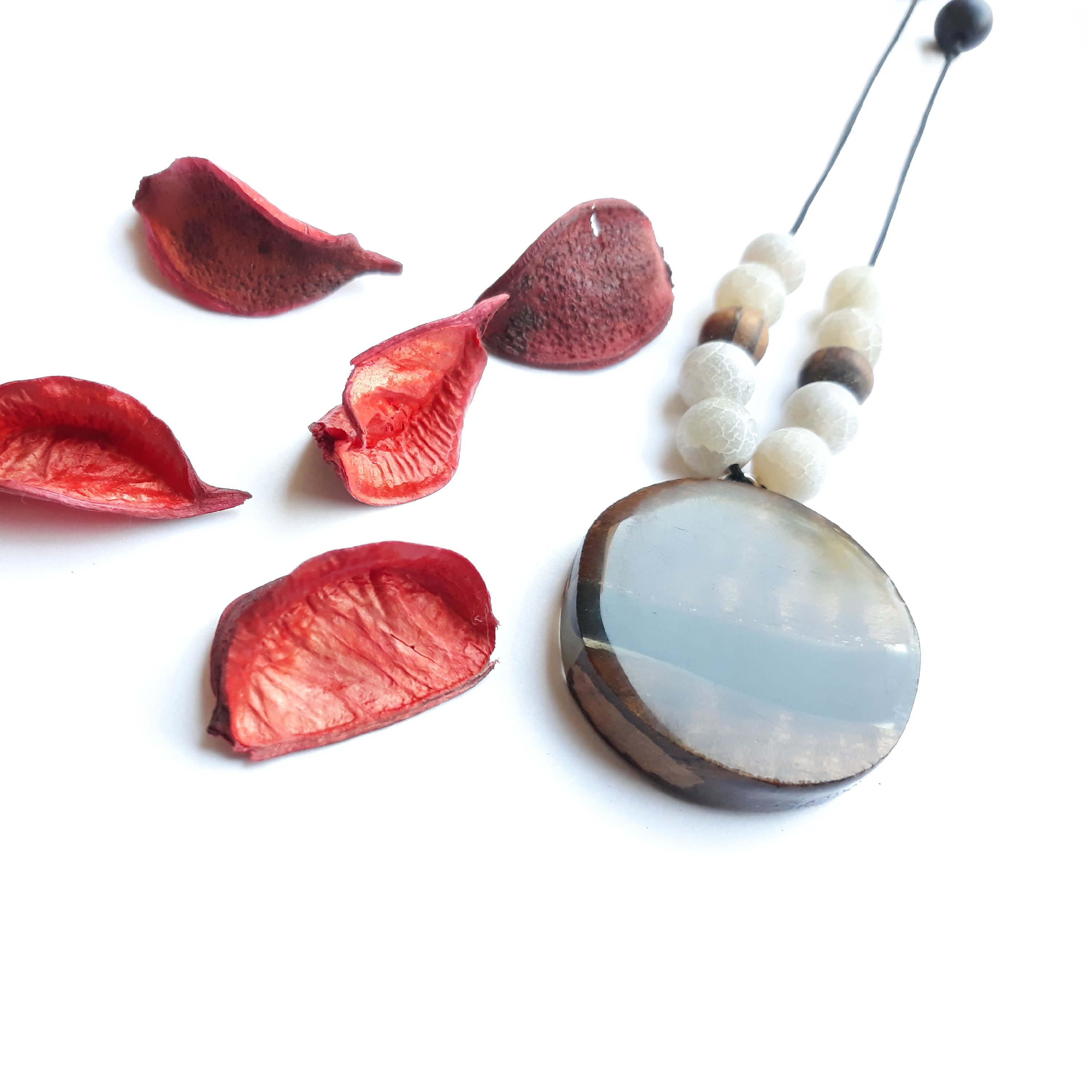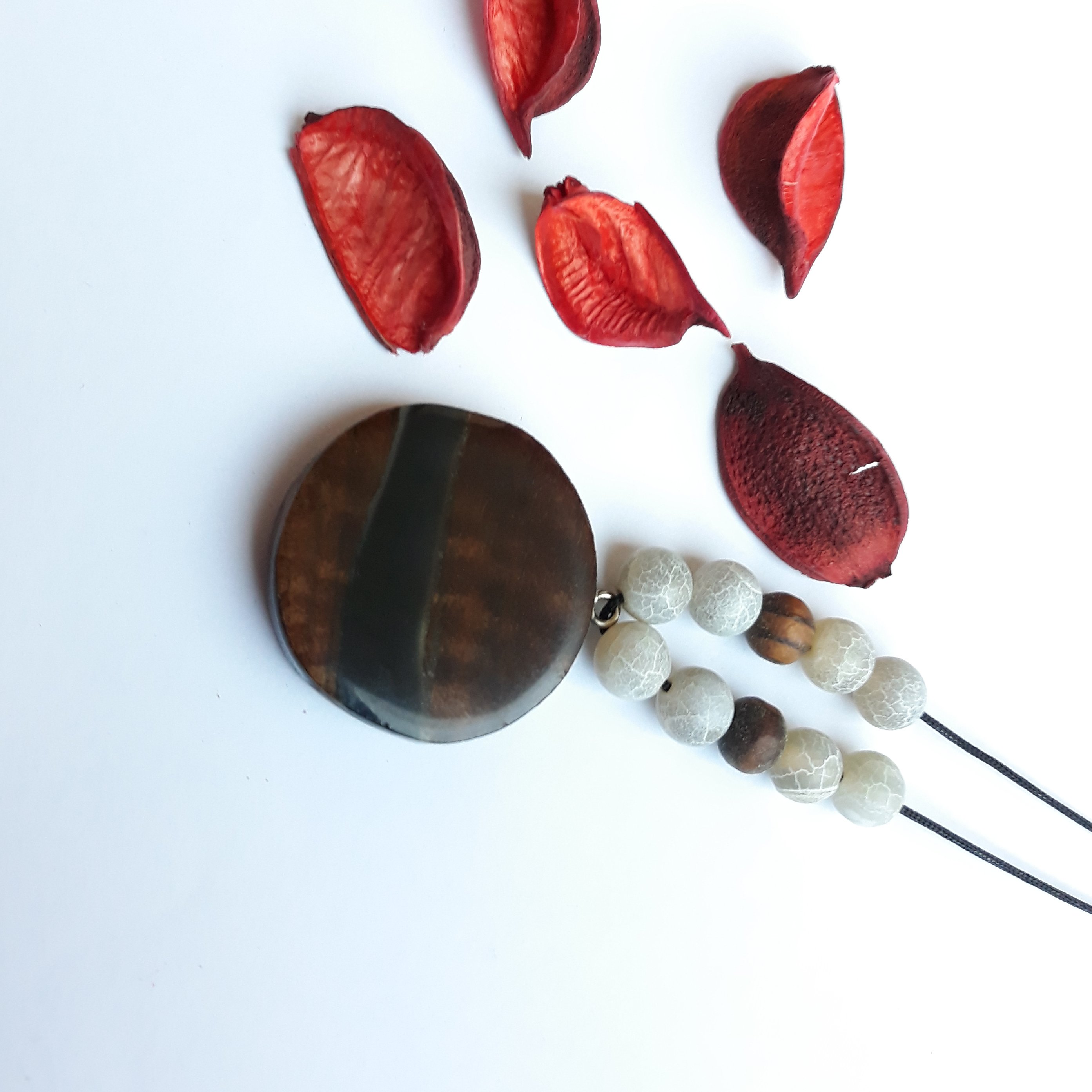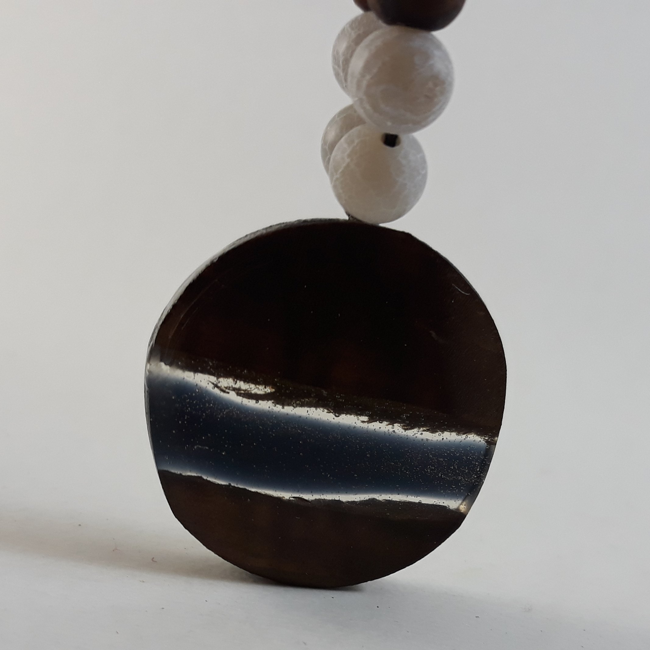 گردنبندی خاص از چوب و رزین با هاله ای مشکی داخل رزین شفاف روش تولید کاملا دستی میباشد و هر محصول منحصر به فرد میباشد کاری برای افراد خاص پسند دارای6سنگ عقیق 2سنگ اونیکس و دو مهره چوبی در بند میباشد از خواص سنگ اونیکس مشکی بکار برده شده نیرو بخشی و مفید برای افراد ورزشکار و افرادی که زیر فشار روحی و عاطفی زیادی هستند مفید میباشد به طوریکه ذهن و جسم را متعادل کرده و قدرت ذهن را افزایش می دهد همچنین سنگی فوق العاده برای افراد دمدمی مزاج است چرا که به تمرکز انان کمک میکندو این سنگ سنگ درمانی چاکرای اول است برای اعتماد بنفس پیدا کردن باید چاکرای اول خود را متعادل کنید از خواص سنگ عقیق که ان را از قدیم ایام سنگ مقدسی میدانسته اند و ان را از خود دور نمیکرده اند عقیق سنگی است که ان را حرز و حامی انسان در مقابل بلایا و حوادث به ویژه در جنگ های میشمارند وبرای افزایش در امد و رونق کسب و کار و اسان شدن کارها بسیار مفید است و برای تقویت نقاط مختلف بدن و برقراری تعادل و هماهنگی در ان بسیار مفید است