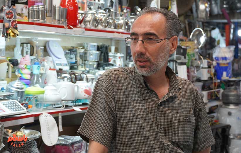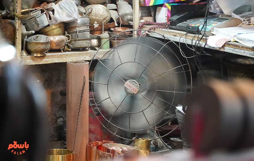 بعد از سلام و احوالپرسی با آقای دلاور میرویم به سمت یکی از قدیمیترینهای بازار! وارد یک مغازه دوبر شلوغ پلوغ میشویم. آنقدر وسیله چیدهاند داخل مغازه که فقط یک راه المانند برای رفت و آمد مشتری باقی مانده. از سر ال وارد میشویم. سمت راستمان پیشخان مغازه است و دو نفر پشتش ایستادهاند. انتهای ال یک کولر آبی بزرگ و پر سر و صدا قرار دارد و کمی آنورتر، میز اوستای مغازه.