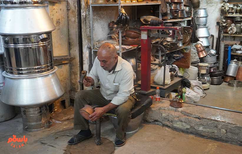 گفتوگویمان بیست تا سی دقیقه بیشتر طول نمیکشد، اما در همین نیم ساعت اوستا حسابی درباره سفیدگری، آفتابهسازی، حال و هوای قدیم و حتی سر و شکل ظاهری بازار برایمان میگوید. در گذشته سقف دکانها و بازار از تیرهای چوبی ساخته شده و به خاطر استفاده از کورهها و زغال سنگ تمام سقفها دودهزده و سیاه بوده. بعدها میراث فرهنگی همه سیاهیها را از سر و روی بازار پاک میکند و به جای تیرهای چوبی، تیر آهنی کار میگذارد.