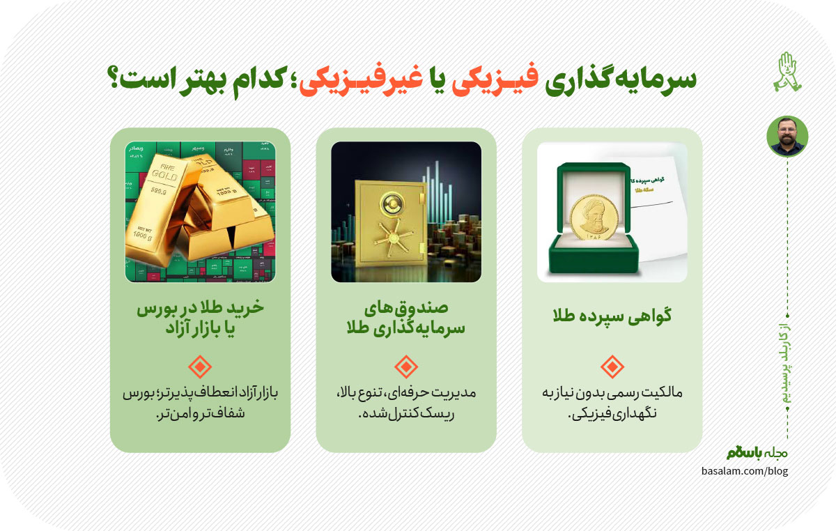 «در حال حاضر طلای فیزیکی انتخاب بهتری است، چرا که بازار طلای غیر فیزیکی نسبتا نوپا است و شفافیت کمتری دارد. البته این به این معنی نیست که گواهی سپرده طلا یا صندوق سرمایهگذاری طلا زیر نظر بورس گزینه بدی هستند، اما پیشنهاد ما در حال حاضر طلای فیزیکی است. طلای غیر فیزیکی این مزیت را دارد که نگهداری از آن سادهتر است و نیاز به گاو صندوق یا صندوق امانات بانک ندارید، اما مشکل یا ریسکی که دارد این است که در ایام تعطیلات نمیتوانید این نوع طلا را خرید و فروش کنید. در حالی که بازار فیزیکی طلا در اعیاد همچنان فعال است و طلا به راحتی خرید و فروش میشود. یا مثلا بازار بورس در ایام تعطیلات بسته است و امکان خرید و فروش طلا در بروس وجود ندارد.، اما مزیت دیگری که دارد، نداشتن مالیات است که در خرید طلای فیزیکی ناچار به پرداخت مالیات هستید.»