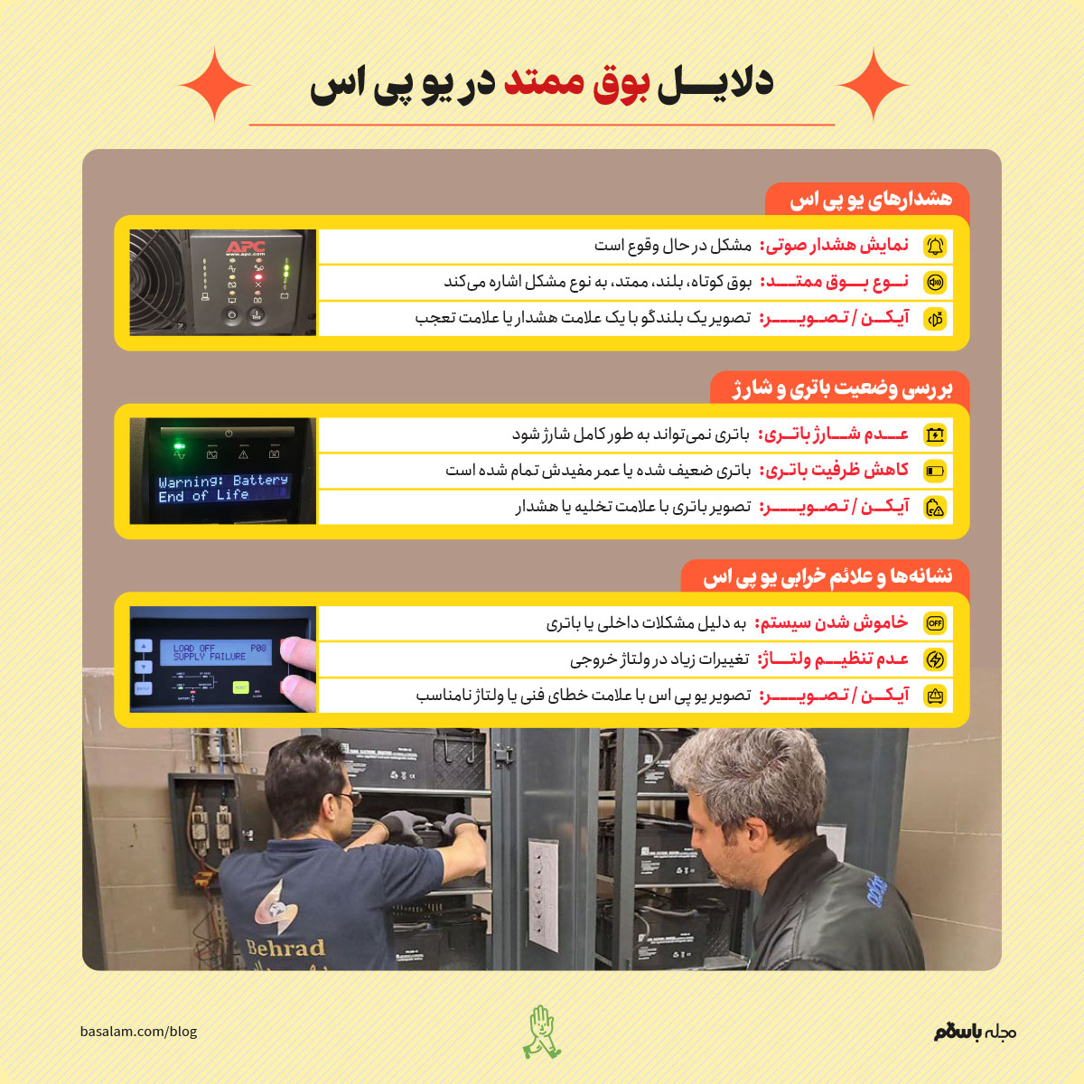 بوق ممتد یو پی اس معمولاً نشان‌دهنده وجود مشکلاتی مثل  اضافه بار ، داغ شدن بیش از حد، خرابی یا ضعیف شدن باتری، نوسانات شدید برق ورودی یا خروجی و خطاهای داخلی دستگاه است.
