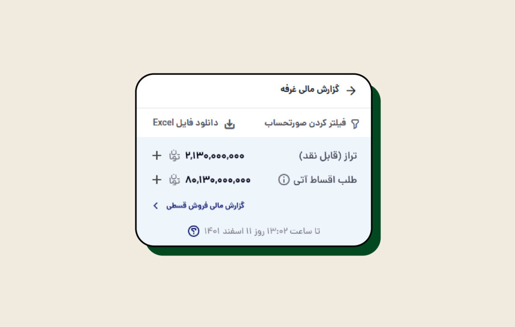 «طلب اقساط آتی» درواقع مبلغی است که موعد پرداختش هنوز نرسیده و هنوز وارد تراز غرفه نشده است. این مبلغ در تاریخ سررسید خودش، بهصورت خودکار به تراز غرفه اضافه میشود.