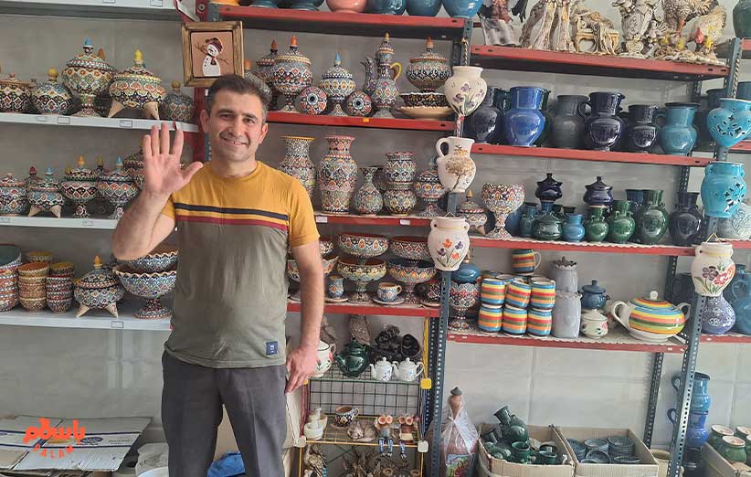 در سالن کناری خانم دیگری یک سینی سفالی در دست دارد و قرار است برای ما به صورت زنده میناکاری روی سفال را نشان بدهد. با تبحر خاصی نقش‌ها را با رنگ‌های متنوع و شاد روی سفال نقش می‌زند و خانم شجاعی در کنارش توضیحاتی می‌دهد. می‌گوید 11 سال است که پروانه تولید دارد.