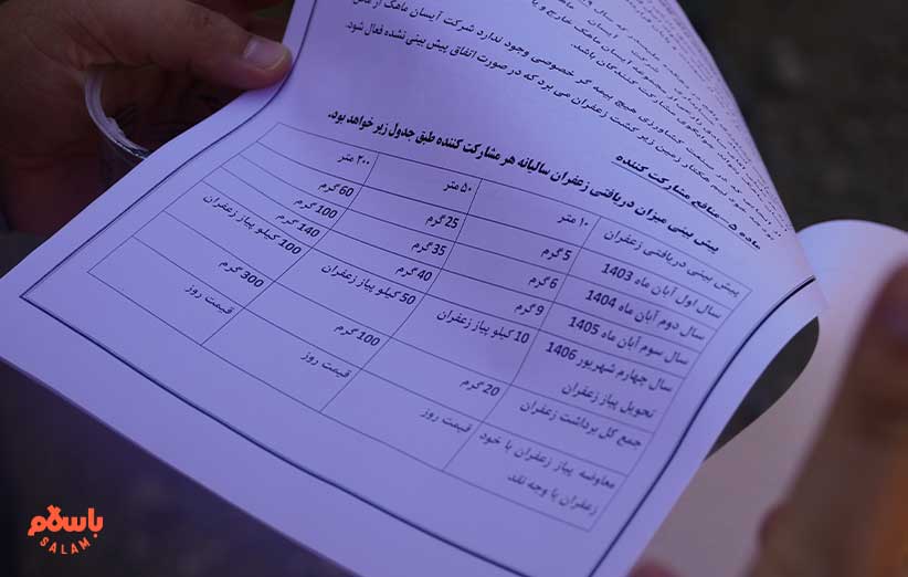 اطراف زمین کشاورزی، سایه‌ای پیدا می‌کنیم و دور صادق و پدرش حلقه می‌زنیم. گفت‌وگوها بیشتر حول محور قرارداد سرمایه‌گذاری است. صادق کم و کیف کارش را توضیح می‌دهد، که مثلا با چقدر سرمایه می‌توان سرمایه‌گذاری کرد و سال اول چندگرم زعفران و سال بعد و بعد و بعد چقدر زعفران گیر سرمایه‌گذار می‌آید.