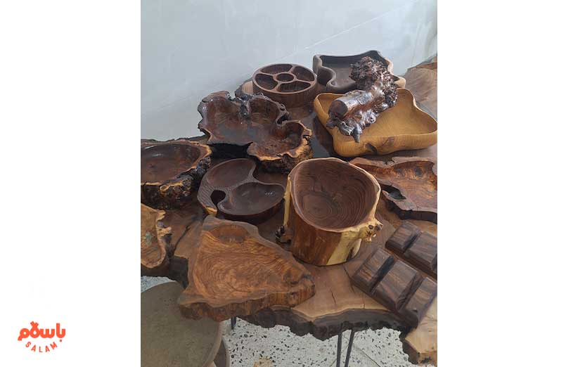 گوشه کنار مغازه پر از مصنوعات چوبی ساخت اقای عزیزی و همکارش است. روی دیوارها هم تا می‌شود محصولات‌شان را آویزان کرده‌اند. از تخته مخصوص برش گوشت گرفته تا جا گلدانی و جا شمعی و کنسول و آینه دیواری و تابلو و… .