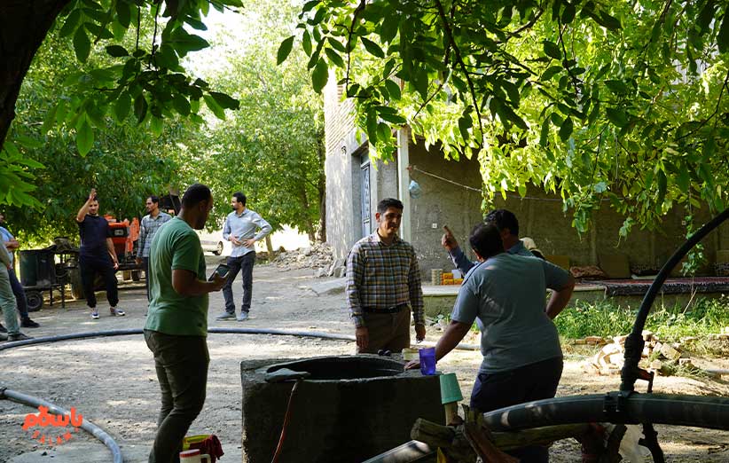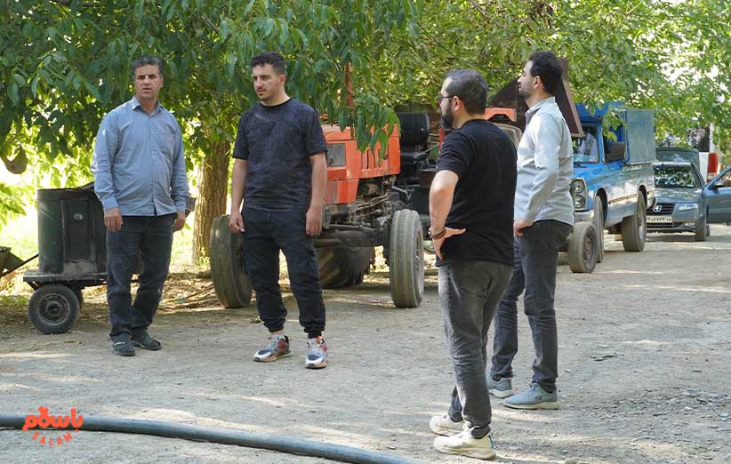 پدر و پسر خانواده کنار یک دستگاه تراکتور زیر سایه درخت‌های گردو ایستاده‌اند و بچه‌ها دورشان حلقه زده‌اند. آن‌طرف‌تر حوض آبی قرار دارد که کنارش یک چاه آب قرار دارد.