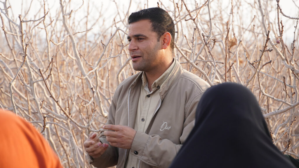 آقای بیگزاده از همان ورودی شهر انار منتظر ماست. سجاد پیاده میشود و دست میدهند. با هم چیزهایی میگویند و دوباره راه میافتیم. بعد از چنددقیقه میرسیم به یک باغ پسته. دور آقای بیگزاده همانجا حلقه میزنیم و با پسزمینه زیبایی از درختهای زیبای باغ پسته گفتوگوها شکل میگیرد.