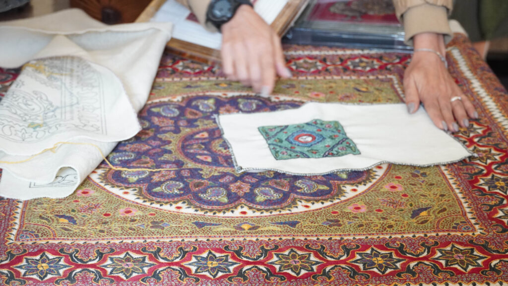 اینجا غرفه گالری پته دوزی صبا است. خانم طاهری علوم اجتماعی خوانده و از همانجا دغدغه شکلگیری این کارگاه را داشته است. همکارانش بهجز پتهدوزی در کار تئاتر و عروسکسازی هم هستند.