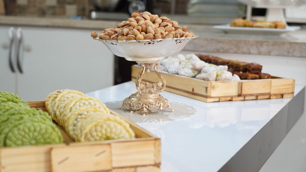 انواع شیرینی مثل کلمپه، قطاب، باقلوا، کیک خانگی و… را در کنار انواع ترشی و قاووت را در غرفهاش دارد. همه اینها را خودش درست میکند بهجز قاووت که تخصصا کار مادرش است.