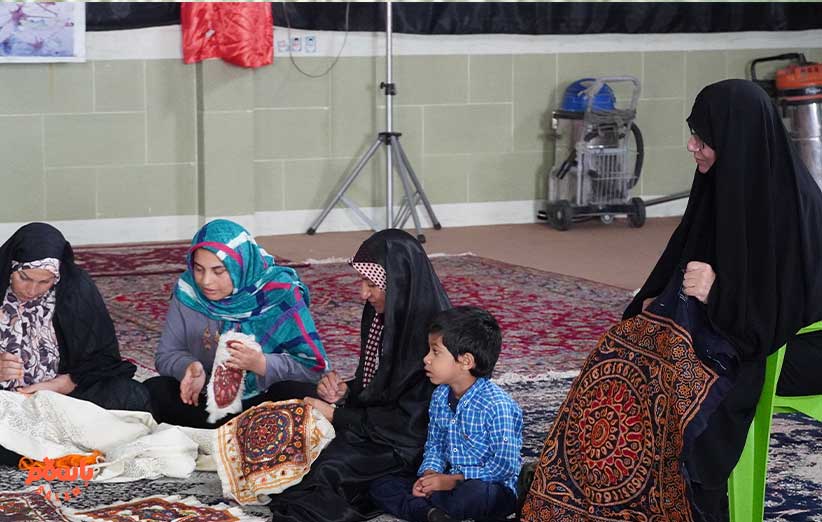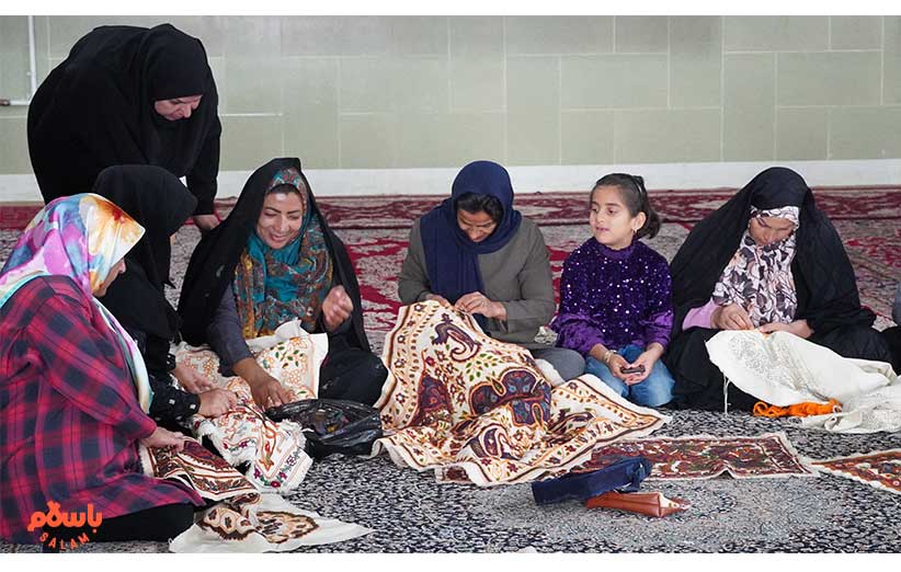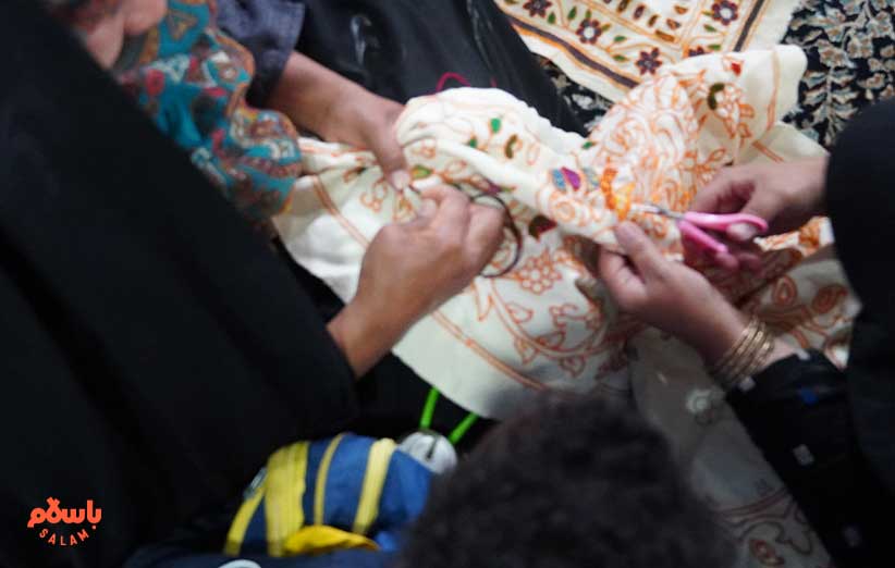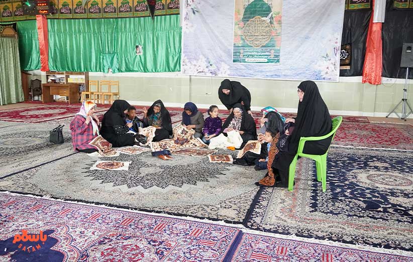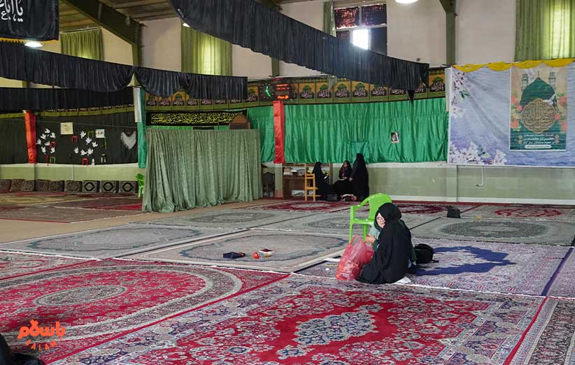 خانم‌هایی که هنگام ورودمان دور هم نشسته بودند و مشغول دوختن بودند، یکی یکی حسینیه را ترک می‌کردند، اما ذره‌ای از آن پویایی کم نمی‌شد. به جای هر نفری که می‌رفت، چند دقیقه بعد فرد دیگری وارد می‌شد و همهمه جدیدی در حسینیه بر پا می‌کرد.