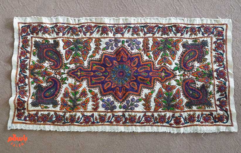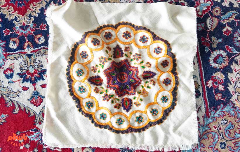 خانم تقریبا سن‌وسال‌داری روی صندلی کنار خانم‌ها نشسته بود و رو به دوربین چیزهایی می‌گفت: «تیکه‌هاش رو هم روی لباس استفاده می‌کنن، یعنی اصلا ضایعات نداره. حداکثر استفاده رو می‌کنن. الان روی لباس خودشونم هست.» و بعد اشاره کرد به خانم تاران.