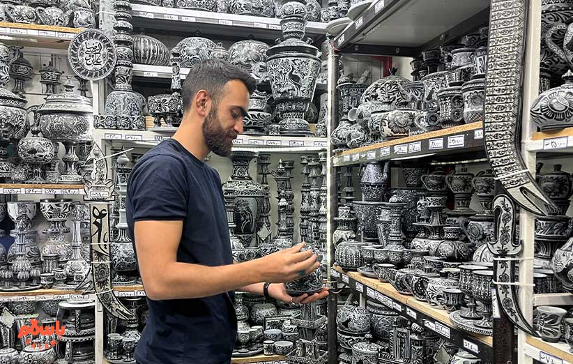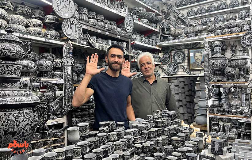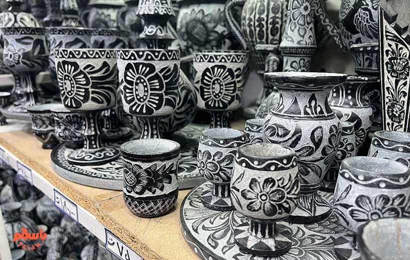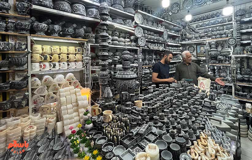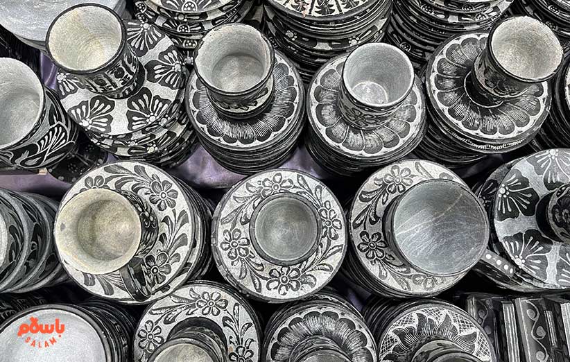 نگاه میکردیم به سنگهایی که دیگر سنگ نبودند، دیگ و لیوان و فلان شده بودند. گفتیم: «این طرحای روشون یه الگوی خاص داره؟ یا میشه توش ابتکار داشت؟» و آقای محمدپور پدر گفتند: «نه، این سیاهقلما هیچ محدودیتی نداره. هرچیزی میشه زد روش. بسته به خلاقیت اون قلمکار داره.» و ادامه دادند که قلمکاری هم با دست ممکن است هم با دستگاه و ارزش کار دست چیز دیگری است. و ما گفتیم توی اکثر حرفهها همین است.از قالی تا نجاری و حتی کشت برنج! یک سوال ذهن ما را درگیر کرده بود و آنهم این بود که حتمی یکجایی دست و دستگاه دیگر اجازه نمیدهد و نمیشود هرچیزی از سنگ ساخت. که گفتند: «نه، شما هرچیزی بگی من میتونم برات سنگیشو بسازم. فقط جایی که قراره رو هم سوار شن به مشکل میخوریم، نشت آب دارن. مثلا همین سماورا که میبینید، تزیینیه! اونجا که شیر براش کار شده آبش نشت میکنه و امکان استفاده ندارن!»