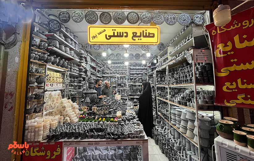 تا چشم کار میکرد، همینطور در یک مغازهی سه در سه سنگ بود که روی سنگ بند شده بود. از دیوارکوب تا هاون و آسیاب و حتی فلاسک چای! گفتیم: «همینجا حرف بزنیم؟ کارگاه نمیریم؟» گفتند کارگاه دو ساعت از مشهد فاصله دارد و نمیدانم چرا یادم به تاکیدهایم افتاد که گفته بودم کارگاه دارید و گفته بودند بله. دوست داشتیم کارگاه را از نزدیک ببینیم. تا بدانیم دقیقا چطور این سنگ سخت را نرم میکنند و سر و شکلش میدهند؟ اما رزقمان نبود انگار. و کمی بعد دلیلش را هم آقای محمدپور پدر گفتند.