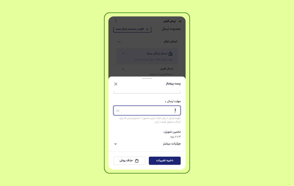 مثلا برای روش پیشتاز مهلت ارسال تعیین کنید. حواستان باشد این مهلت ارسال با زمان آمادهسازی جمع میشود و اگر زمان ارسال و آمادهسازی زیادی تعریف کرده باشید ممکن است مشتری ترجیح دهد از غرفه دیگری که ارسال سریعتری دارد خرید کند.