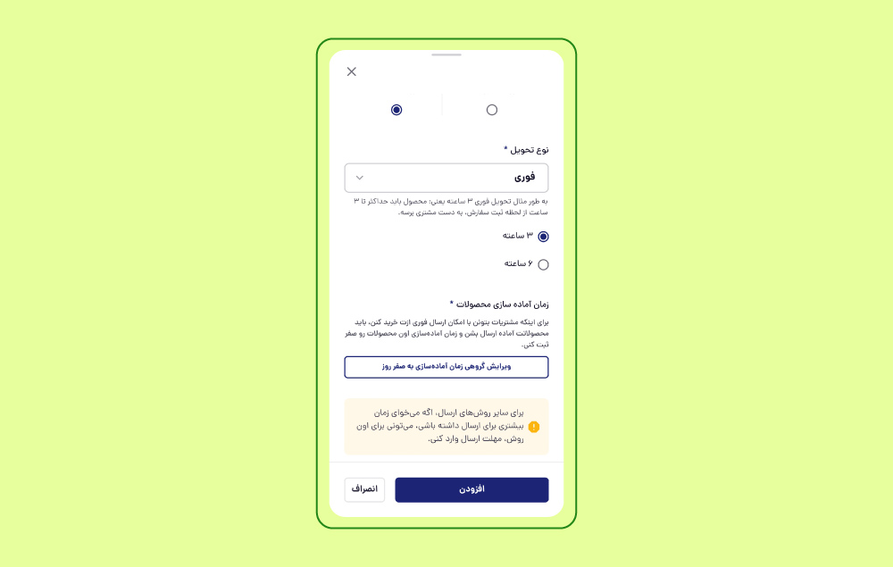 شما میتوانید برای سفارشهای با روشهای دیگر غیر فوری (عادی)، مهلت ارسال مشخص کنید.