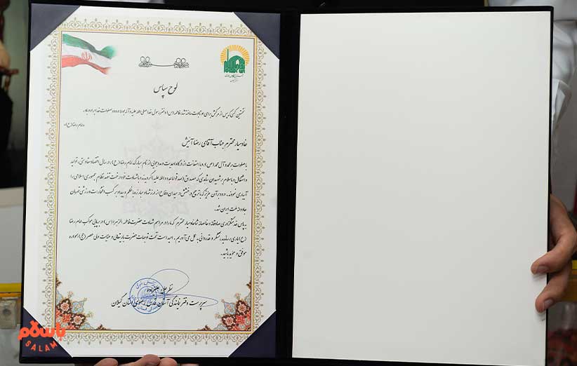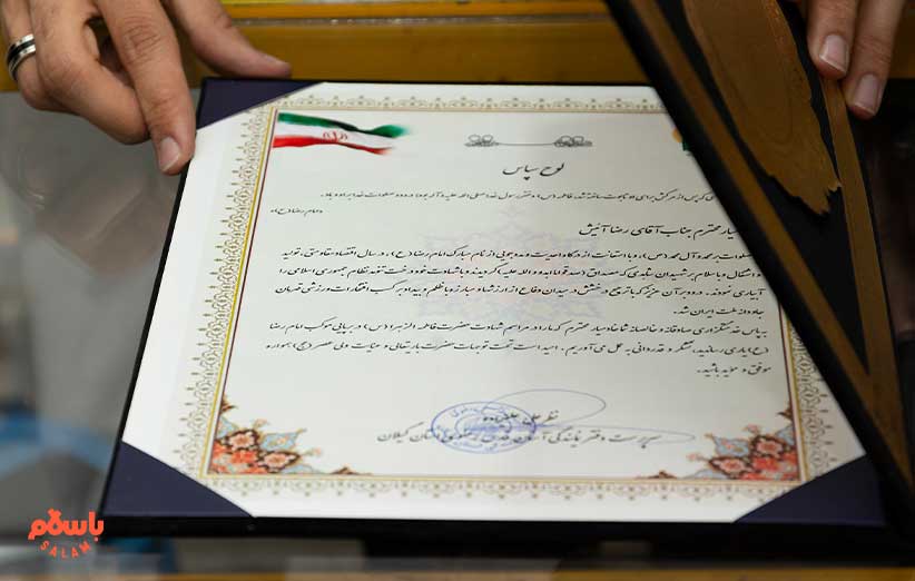 لوحِ مشکی_ طلایی را با احترام پایین میآورد، سلفون دورش را باز میکند، بوسهای روی جلدش میکارد. حکم خادمیاش را نشانمان میدهد. و دوباره با احتیاطی شبیه حمل کردن یک ظرف بلورین، لوح را برمیگرداند سرِ جایش. لوح روی قلبِ دیوار، وسطِ مقامها و مدرکها جا خوش میکند. تو گمان کن مثلِ نگینِ انگشتری!