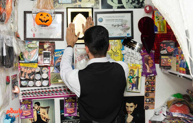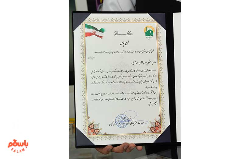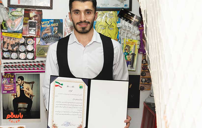 روی دیوارِ کوچک پشت سرش، تا توانسته قاب چسبانده. وسطِ قابهایی که نشان میدهند رضا توی تردستی درخشان است، یک لوحِ مشکی_ طلایی سلفون پیچ شده هم هست.تک به تکِ نوشته قابها را میخوانم و گیر میکنم روی لوح مشکی_طلایی.