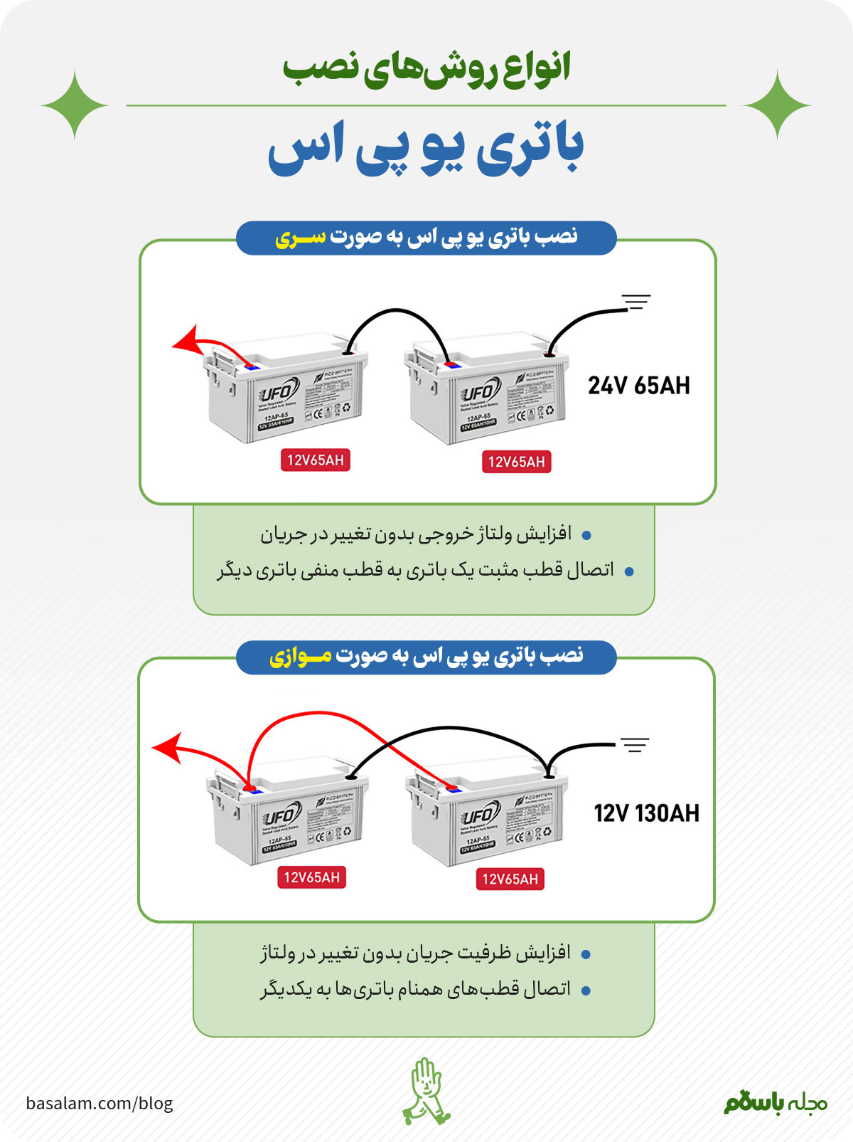 روش‌های نصب باتری یو پی اس به دو صورت موازی و سری وجود دارد. برای آشنایی با روش‌های سری و موازی ساده‌ترین کار این است که با دقت موارد زیر را بخوانید: