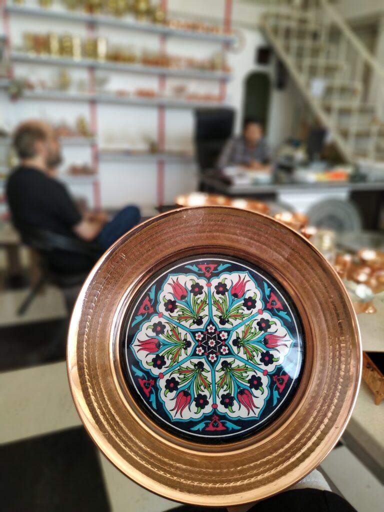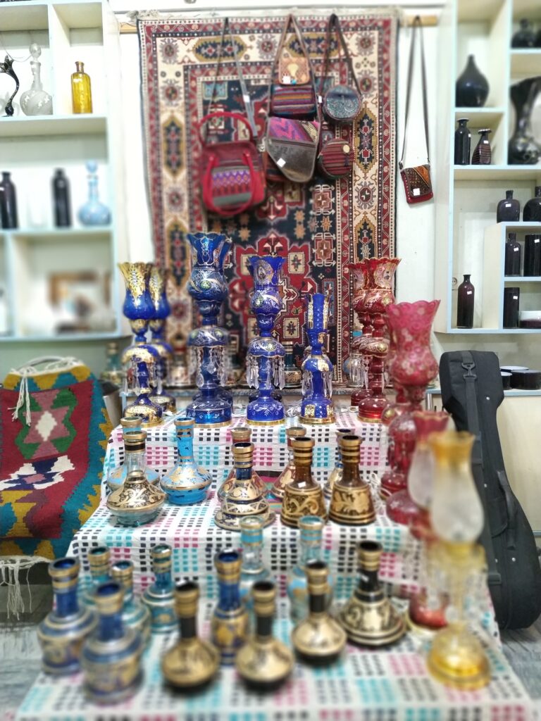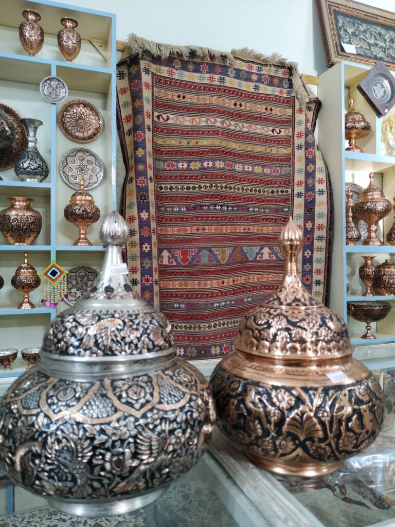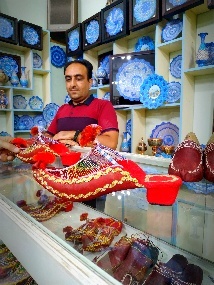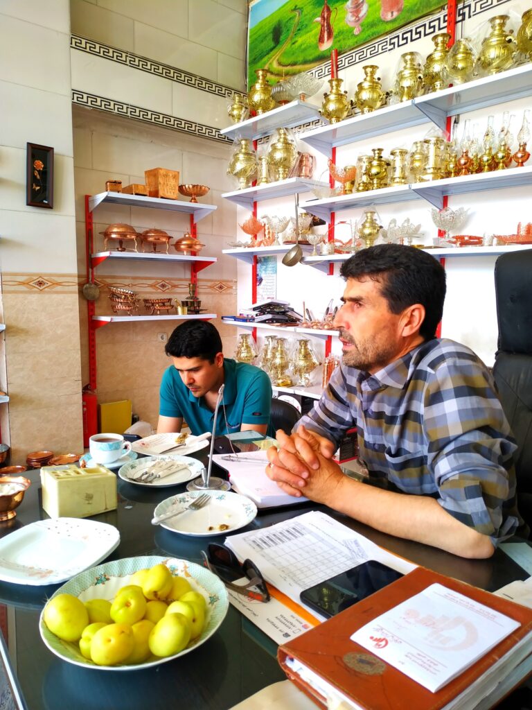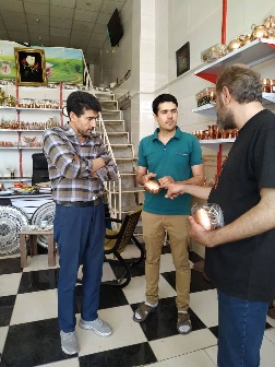 آقای واحد ما رو پیش شریک غرفهدارشون بردند، که فروشگاه بزرگ و سنتی بود. آقای نجفی که در زمینه صنایع دستی بسیار خبره بودند بسیار متواضعانه از بازار زنجان و کیفیت متفاوت صنایع گفتند.