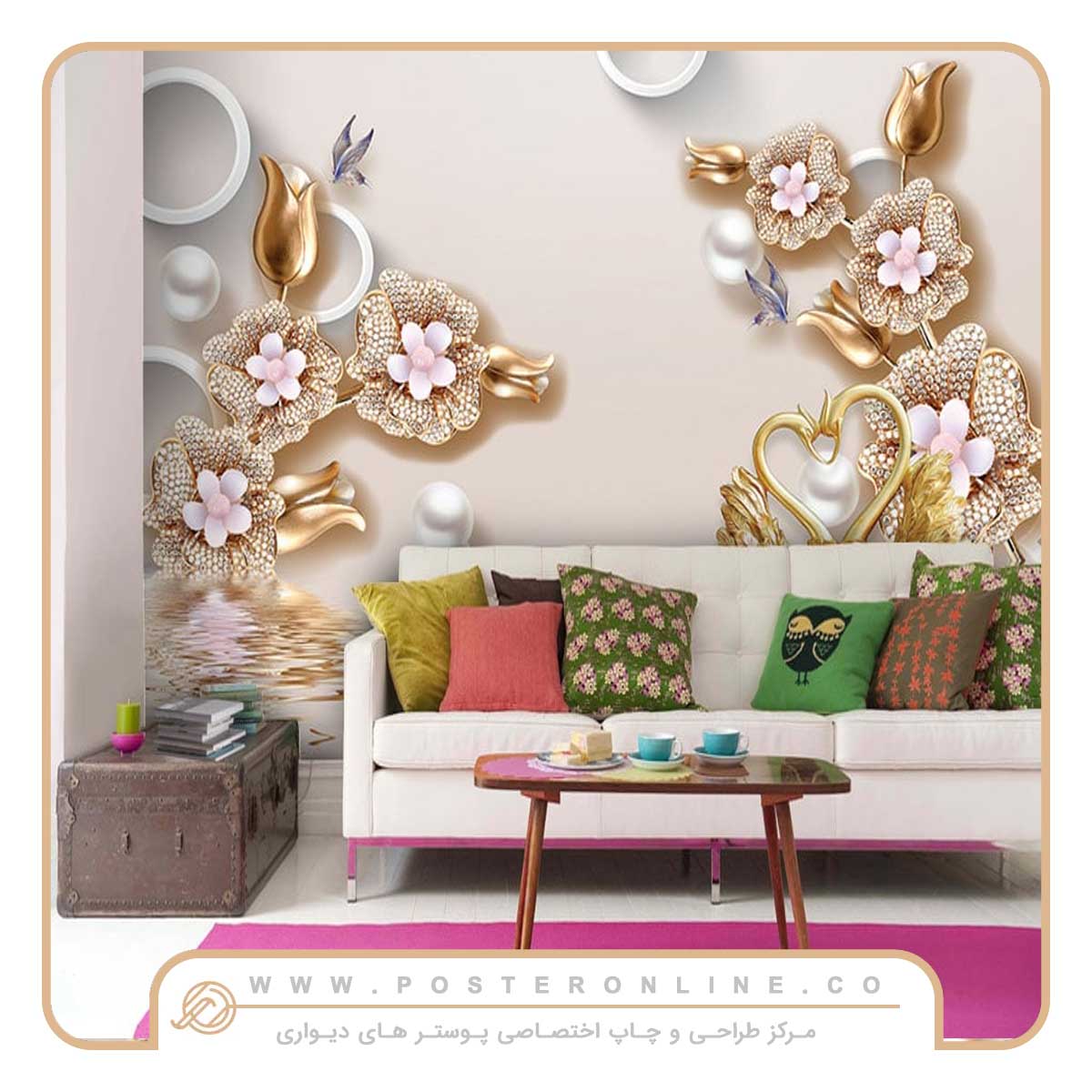 پوستر دیواری سه بعدی پشت تلویزیون طرح گل طلایی ضد اب