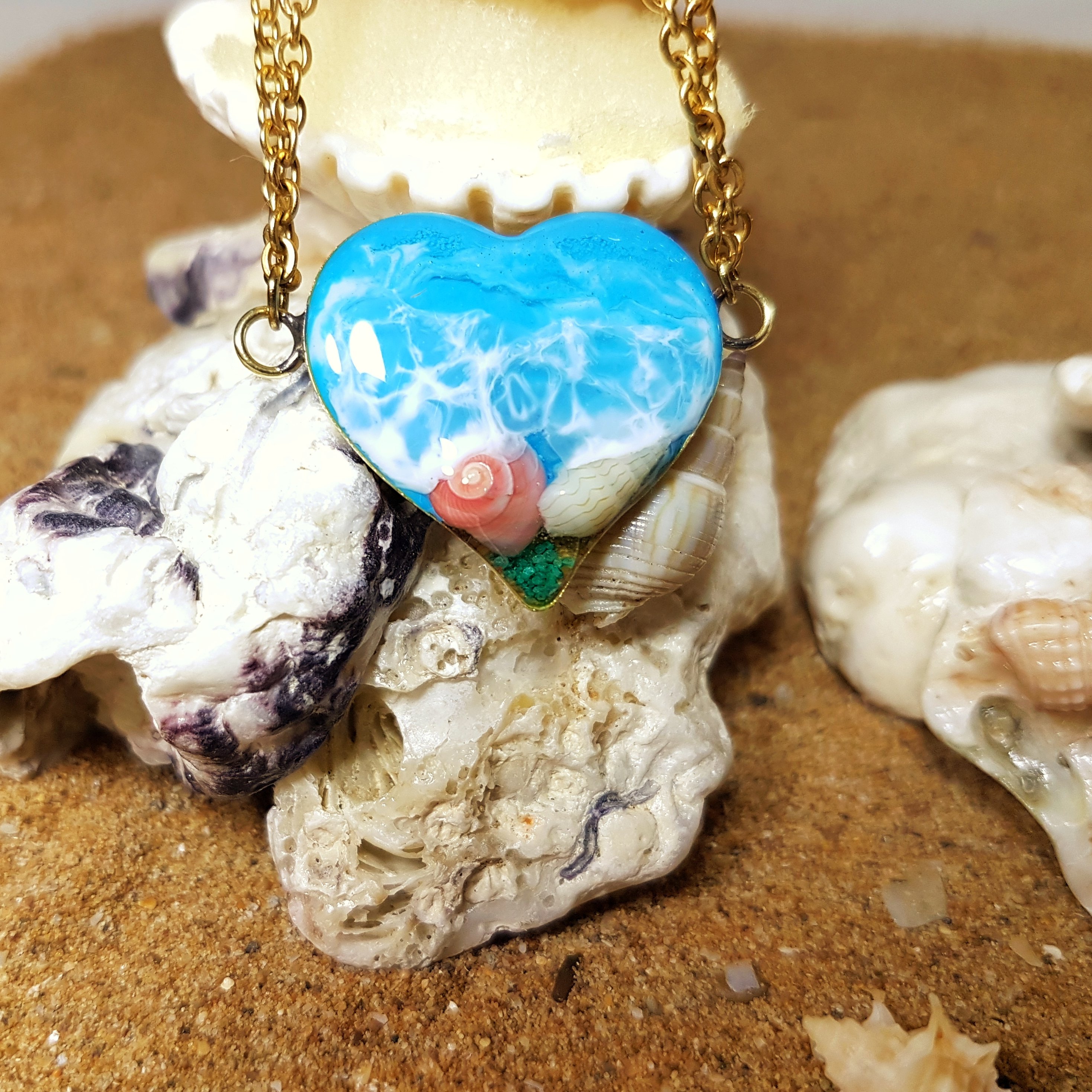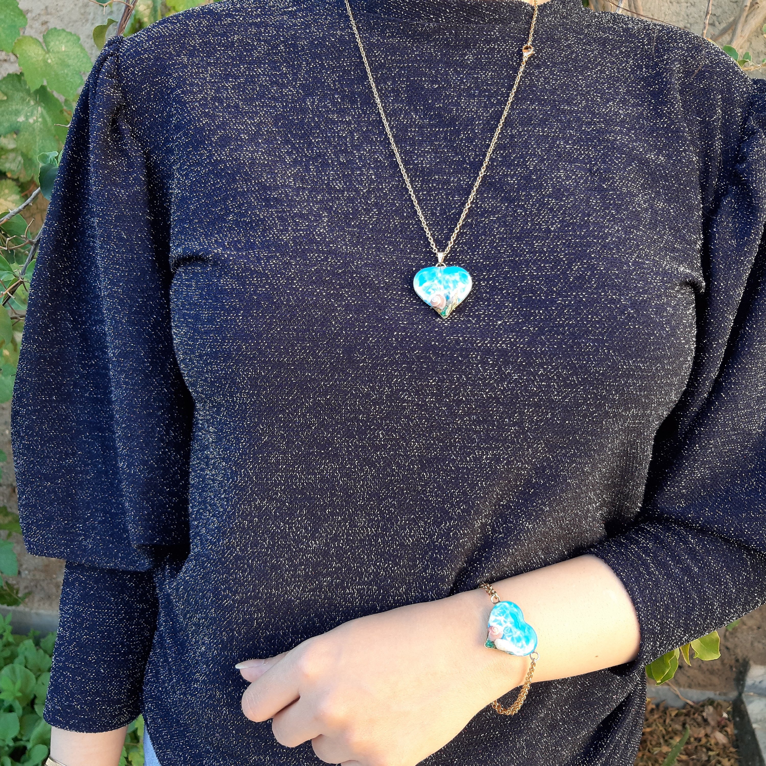 نیم ست قلبی طرح ساحل دریا شامل گردنبند و دستبند فرم برنجی زنجیر استیل رنگ ثابت و ضد حساسیت قابل سفارش با صدف و رنگ دلخواه شما (کمرنگ یا پررنگ)