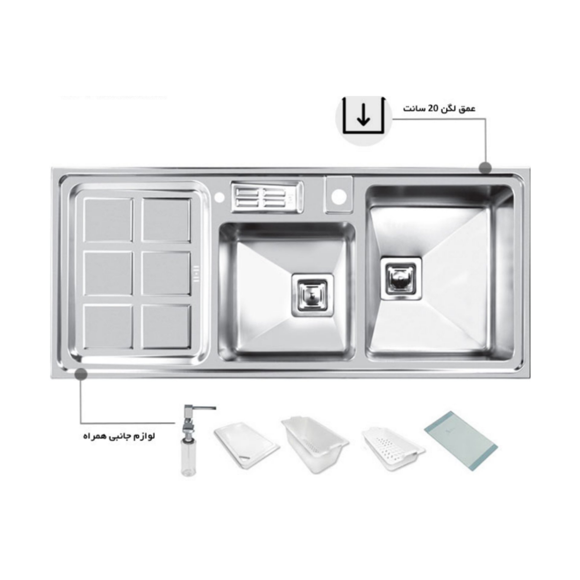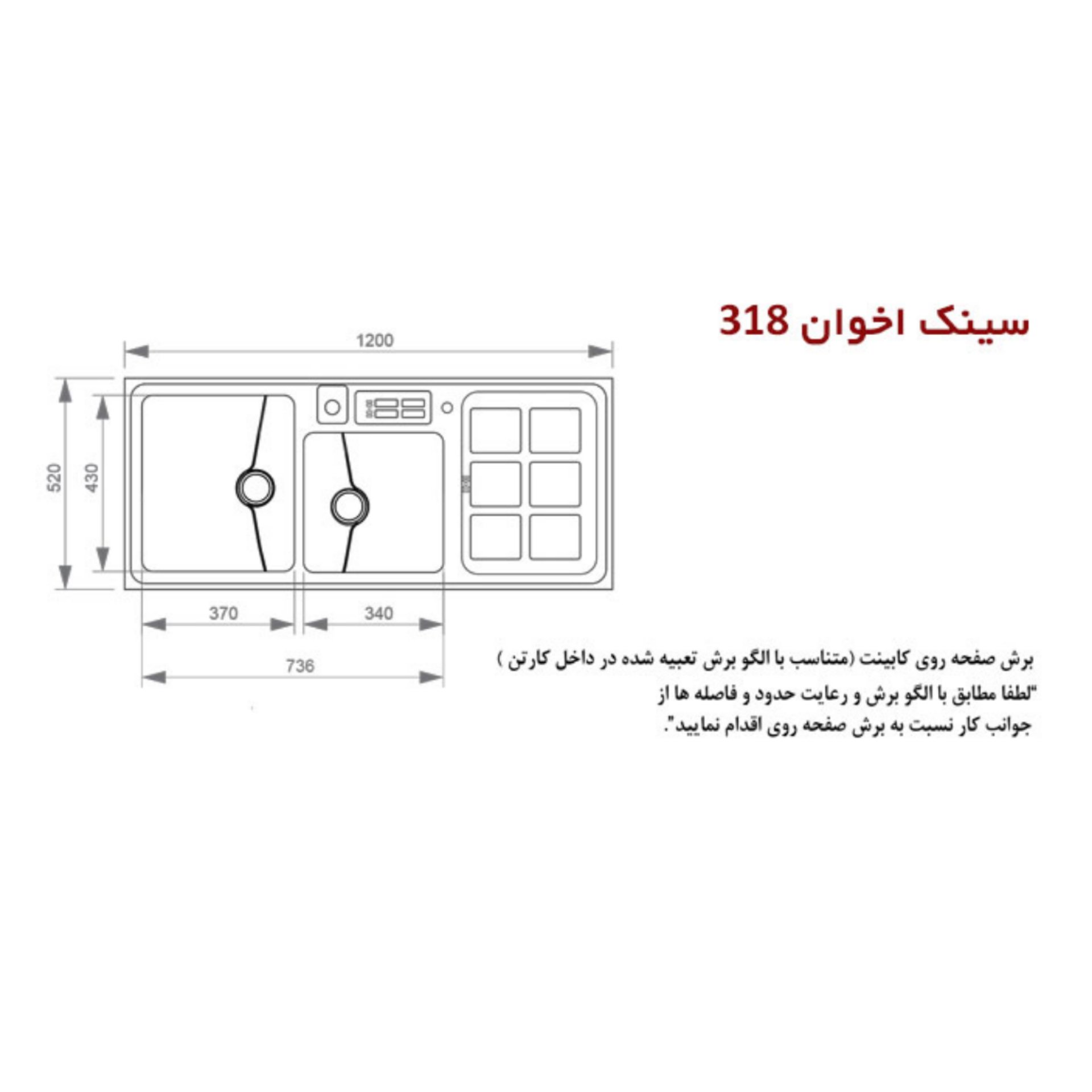 قبل از خرید این محصول استعلام موجودی وقیمت بفرمایید 09105422682 09305592688 ارسال همه محصولات از طریق باربری به سراسر کشور . هزینه ارسال به عهده خریدار میباشد نام محصول : سينک ظرفشویی اخوان 318 | Akhavan sink 318 inset نصب به صورت : توکار نوع ورق استیل : استیل ضد زنگ Aisi – 304 تعداد و نوع لگن : دو لگن – یک لگن بزرگ و یک لگن متوسط ضخامت ورق استفاده شده : استیل با ضخامت بالا | یک میلیمتری ابعاد خارجی محل نصب : 120 در 52 سانتی متر عمق لگن : دارای لگن عمیق 20 سانتی متر سمت لگن ها : قابلیت انتخاب لگن چپ و راست در هنگام سفارش لوازم سیفون: دارد به همراه زیراب فانتزی بزرگ همراه با جامایع + جا اسکاجی بر روی سینک لوازم جانبی همراه : سبد , تخته گوشت پلاستیکی , شیشه ای و سبد میوه شور می باشد. امکان اضافه شدن تخلیه لباسشویی : دارد سوراخ نصب شیر : دارد – امکان نصب شیرالات با وزن بالا نوع اتصال سینک به کابینت : بست فلزی نوع زیراب استفاده شده : مربع با تخلیه سریع نوع طراحی لگن : طراحی لگن ها R25 ( ...