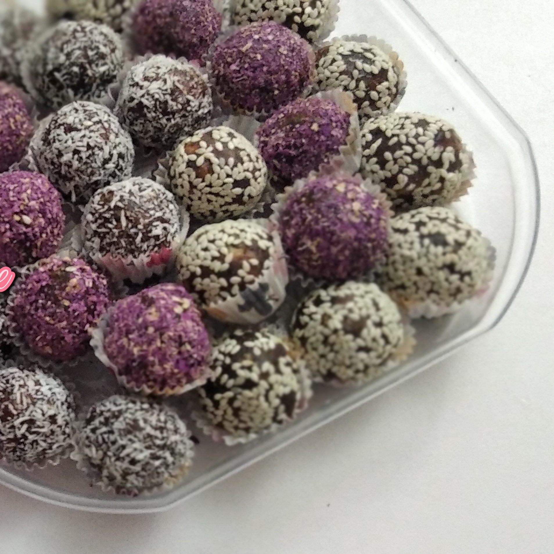 سینی خرما شامل توپک های خرمایی با طعم گل و کنجد و نارگیل. خرما با مغز گردو