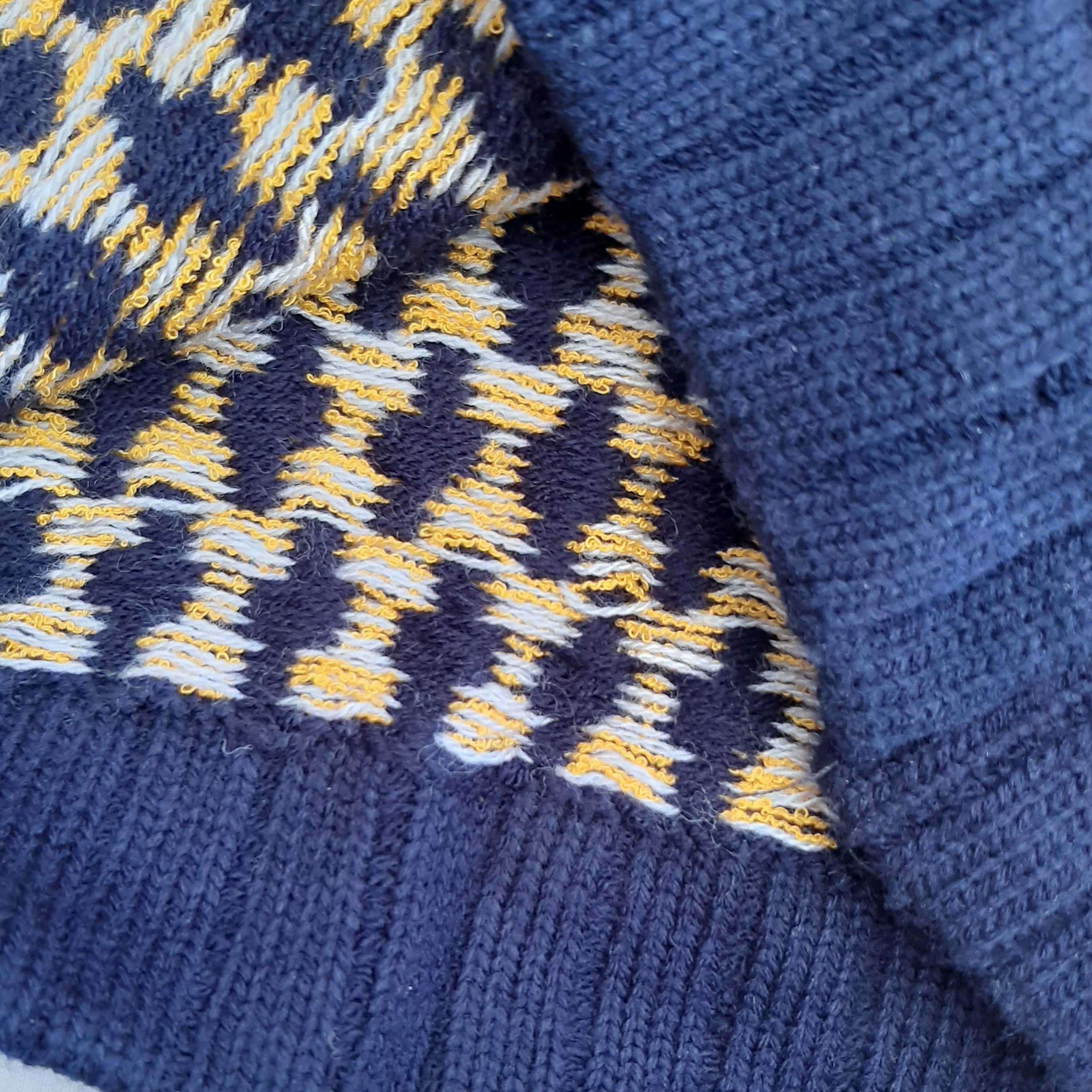 بافت ضخیم دگمه دار دورنگ بافی بانخ ساده وبوکله سرمهای و زرد يقه مردانه