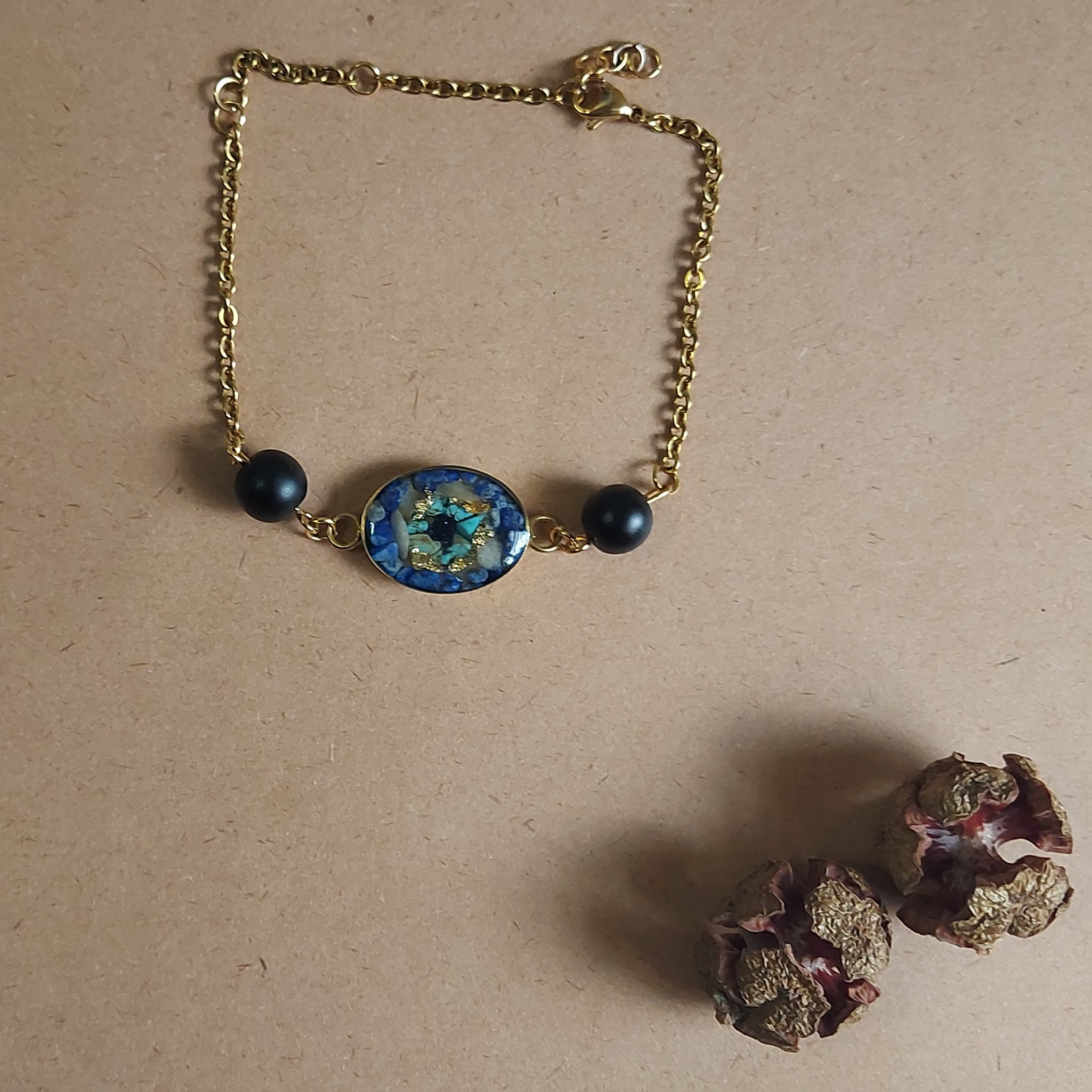 دستبند برنجی چشم نظر محصول با رزین شفاف و قاب برنجی با کیفیت بالا و ۵ نوع سنگ ساخته شده است محصولی ظریف می باشد درون قاب از سنگ های دلربا فیروزه نیشاپور، لاجوردی، عقیق و ورق طلا به کار رفته است