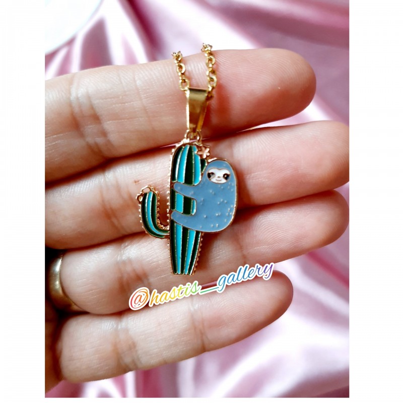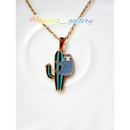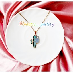 گردنبند با پلاک طرح کآکتوس و تنبل درختی بسیار شیک و جذاب پلاک رنگ ثابت نیست ولی دیر سیاه میشود. زنجیر قفل و حلقه ها و سرپلاکی تماما استیل و رنگ ثابت میباشد.