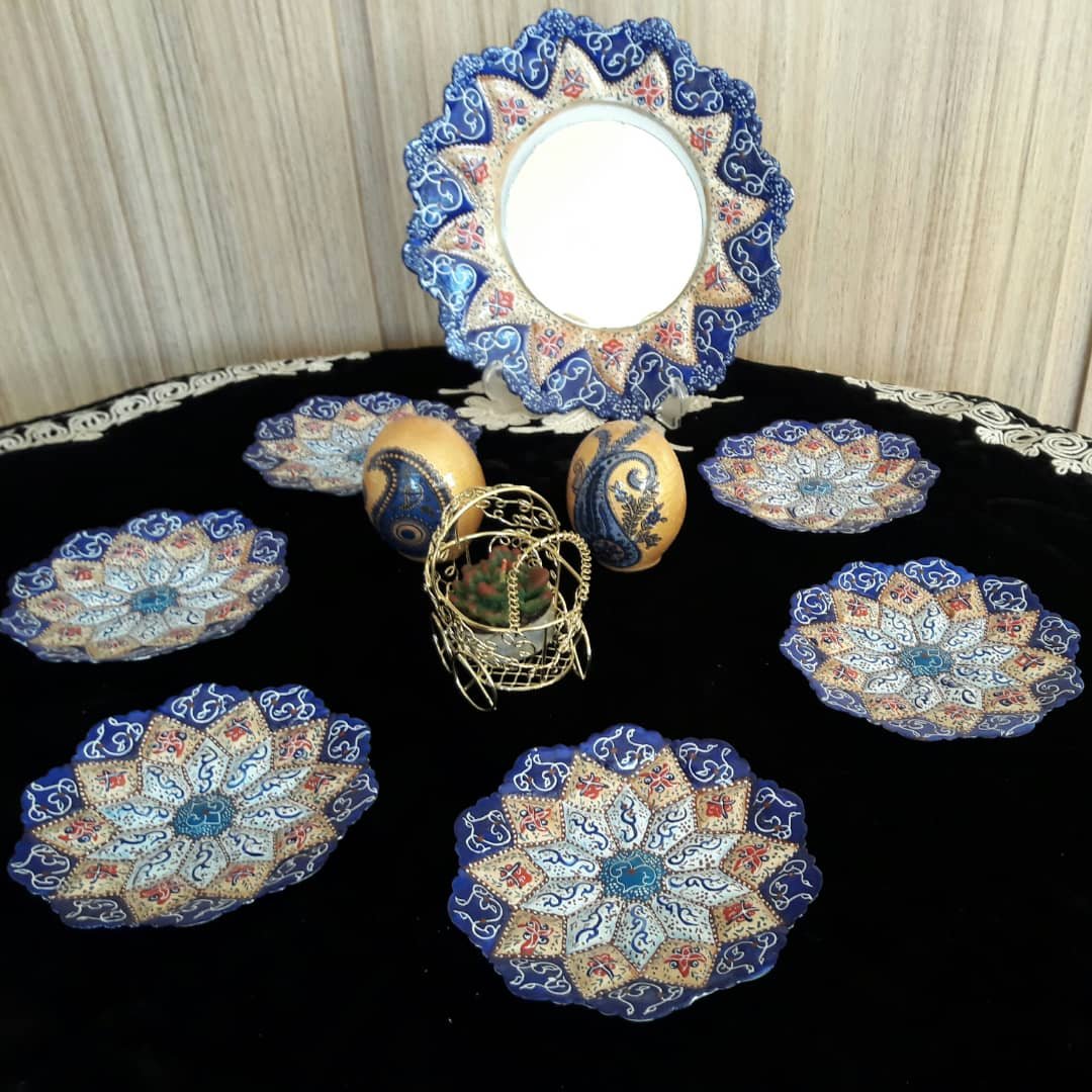 رنگ: نقاشی شده ابی فیروزه ای - مناسب برای: هفت سین - ابعاد: قطر 15 سانت - جنس: مس - سایر توضیحات: هفت سین مینا همراه با اینه و تخم مرغ