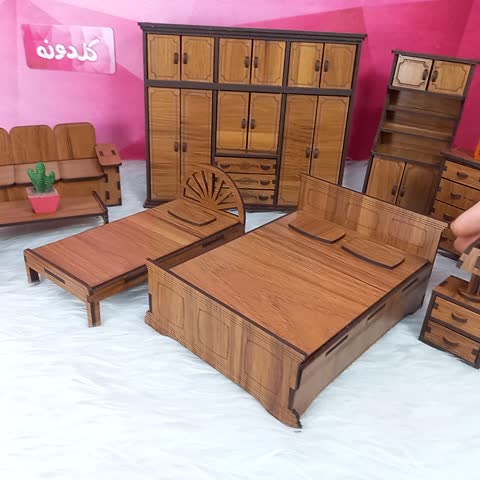 ست پاتختی و آباژور مینیاتوری چوبی-عسلی و آباژور چوبی-کشو اسباب بازی دخترانه-کشو چوبی-دراور باربی-تخت اتاق خواب گلدونه