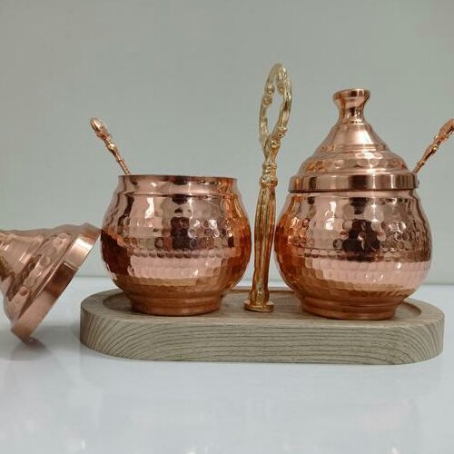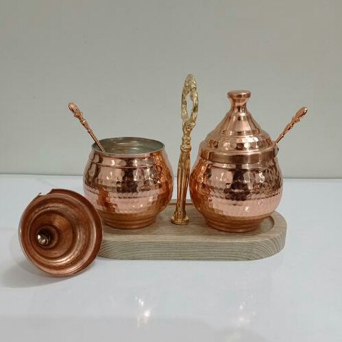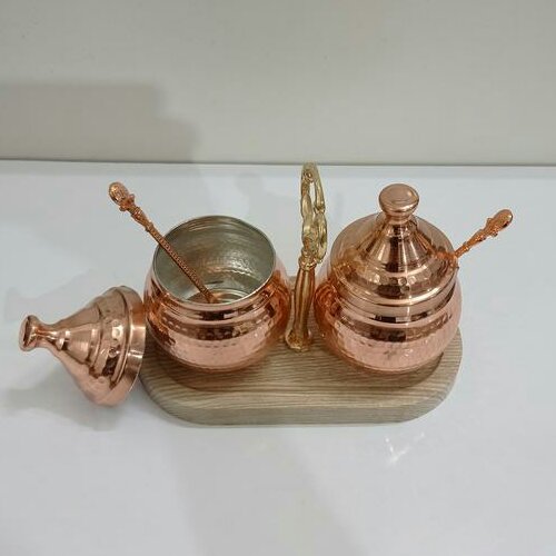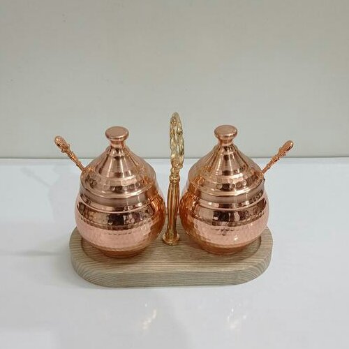 این ظرف مسی برای استفاده به عنوان جا ادویه و مربا خوری کاربرد دارد و نانو شده میباشد و دارای قاشق مسی و استند همراه دسته آویز میباشد. استند از جنس ام دی اف و دسته از جنس برنج میباشد.