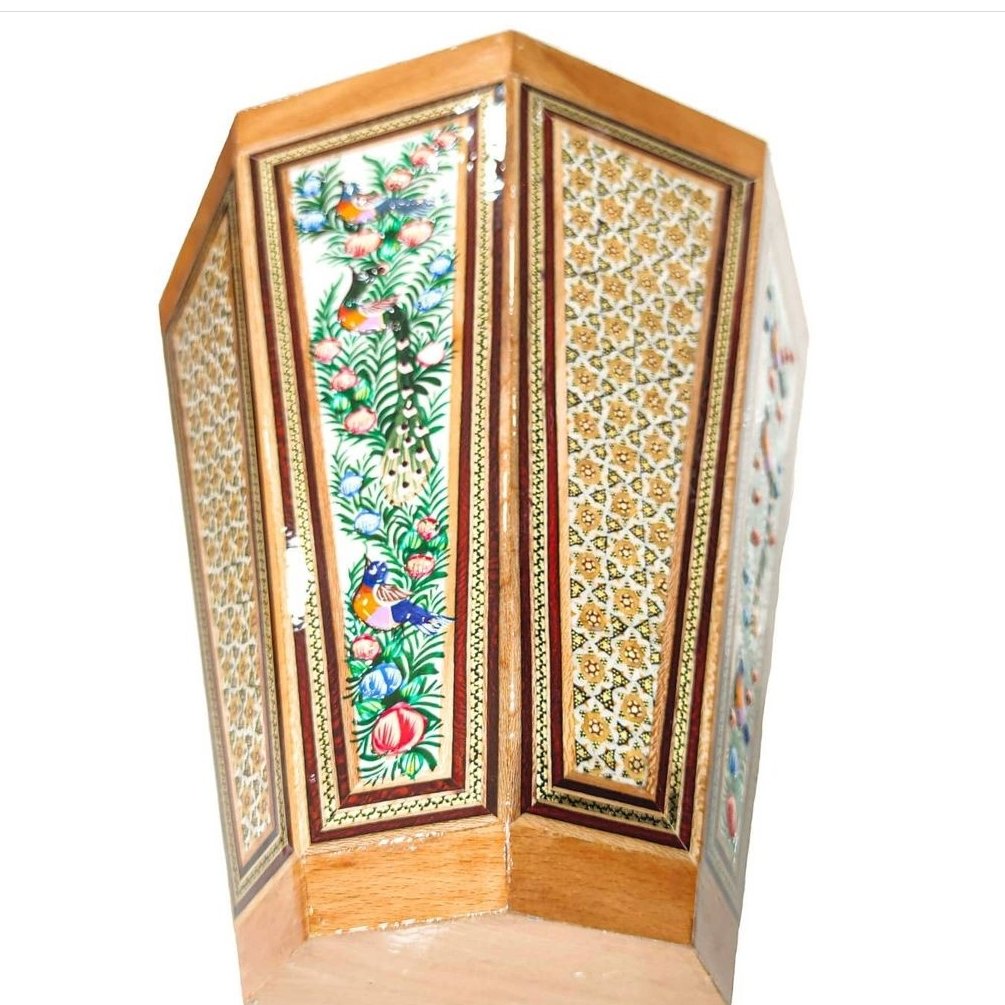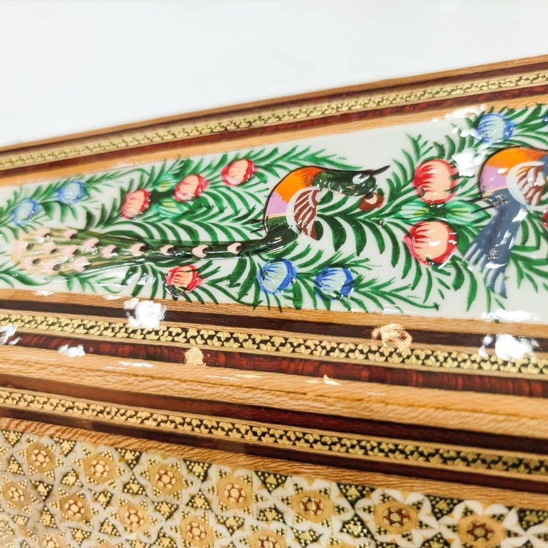 بسیار شیک و زیبا.خاتم کاری این محصول روی چوب کار شده است. به منظور بادوام تر شدن و افزایش طول عمر و همچنین براق شدن از پلی استر روی محصول کار شده است