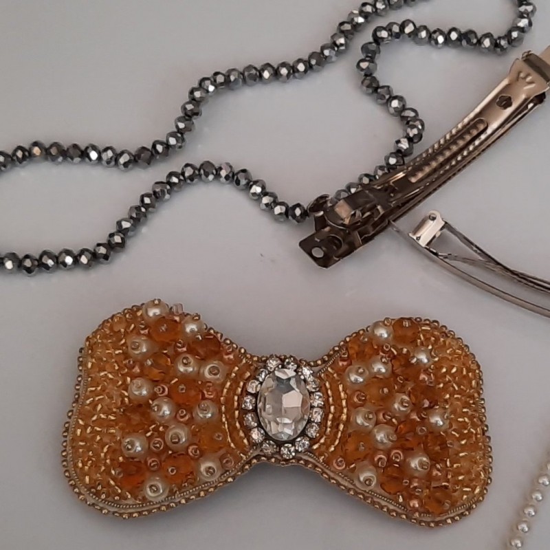 پشت کار چرم وبا گیره فرانسوی به مو هی شما وصل میشود.رنگ کار عسلی است و متریال به کار رفته بسیار با کیفیت است.