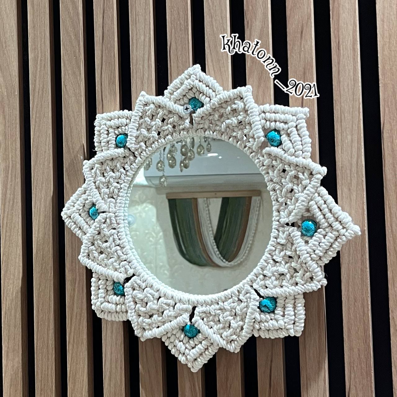 اینه مکرومه طرح خورشیدی یه طرح زیبا با مهره های. برای. نگی که در این کار رنگ فیروزه ای هم کار شده این اینه به عنوان اینه شلف دار هم قبل احرا شده در قیمت دسته بندیها روی شلف مکرووه بزنید و از زیباییش دیدن کنید برای سفره هفت سین برای بالای کنسول برای هر جایی که نیاز به اینه دارید قابل ایتفاده آیت البته با رنگ و ابعاد مشخص و مورد نیاز سما. قطر خود اینه ۲۰ و با بافت حدود۵۰ سانت قطر کلی است این کار رنگ شیری و مهره فیروزه ای کار شده است✨
