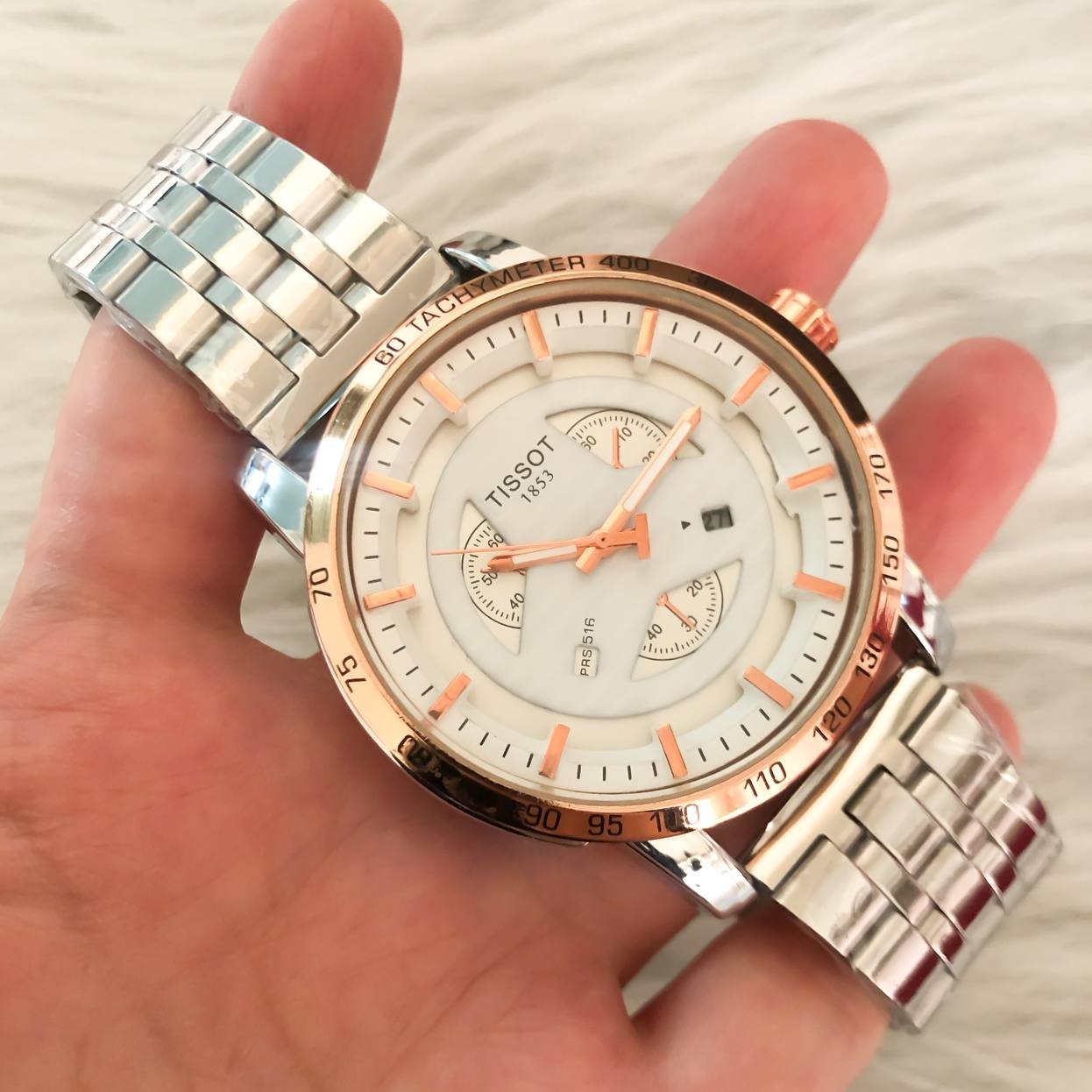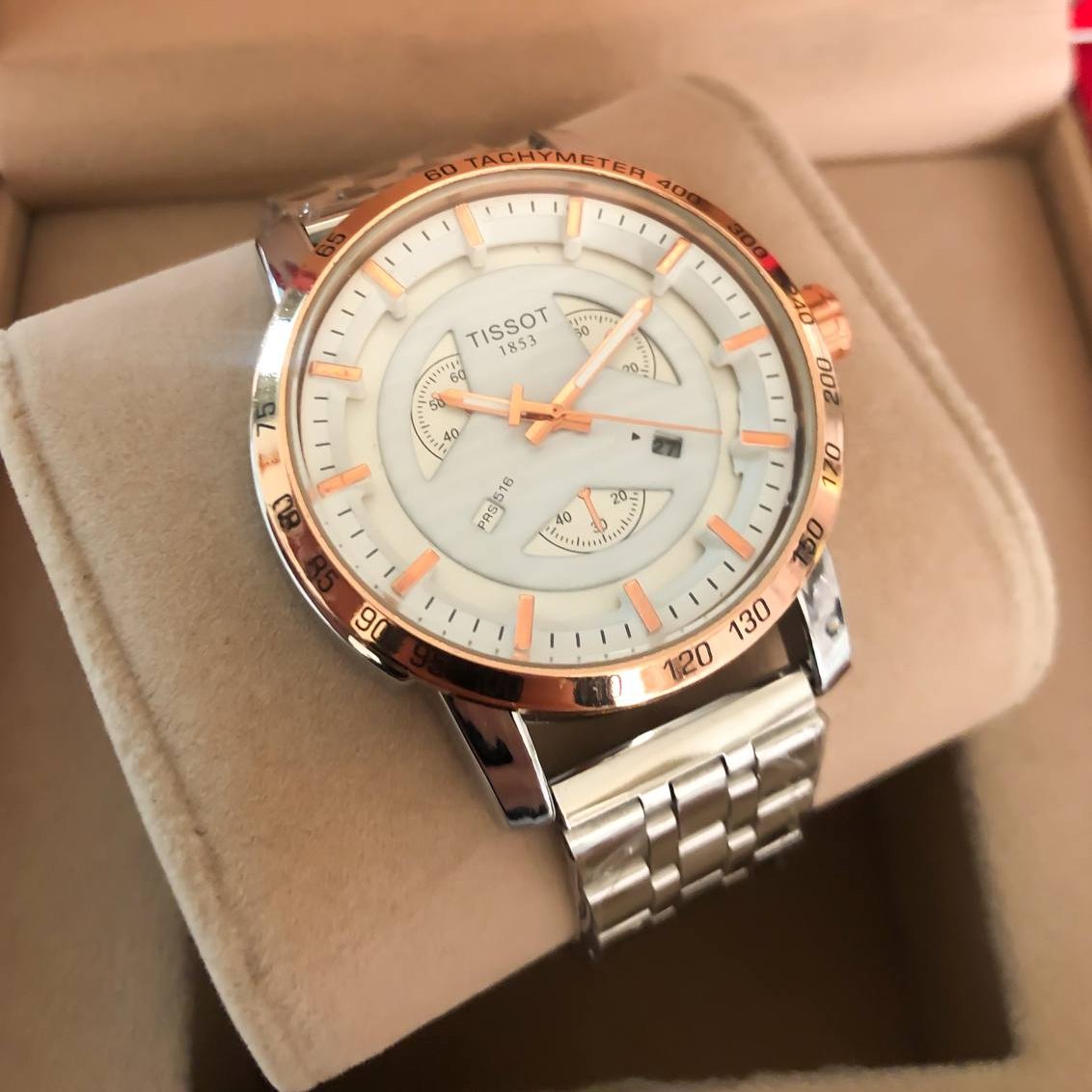 ساعت تیسوت مردانه بنداستیل رزگلد صفحه سفید کیفیت عالی تک موتوره. طرح سه موتوره دارای تقویم شش ماه گارانتی موتور دارای جعبه چوبی مخصوص ساعت و کارت ضمانت قطر شیشه ساعت حدودا ۴ سانتیمتر لطفا قبل از فروش موجودی استعلام بگیرید