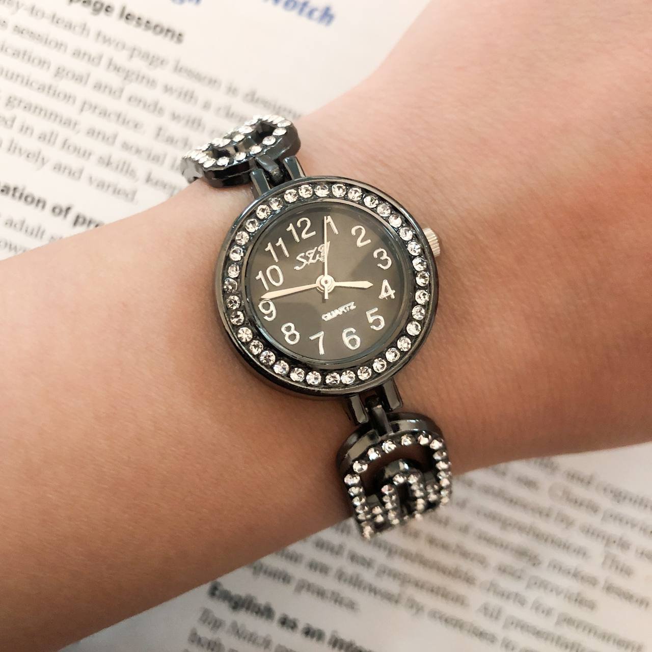 ساعت زنانه مجلسی نگین دار بندفلزی مشکی کیفیت عالی وارداتی از دبی شش ماه گارانتی موتور دارای جعبه کادویی مخصوص ساعت و کار