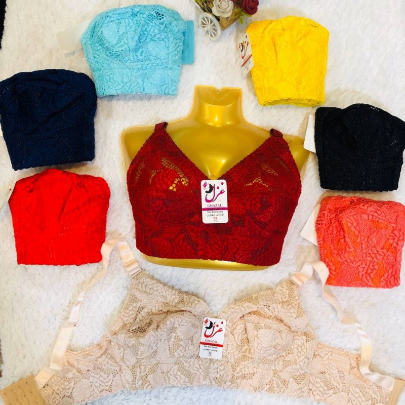 سوتین زنانه دانتل کش پهن مخفی گیپور محکم سایز 75 داره در رنگ زیبا زرد ۷۵