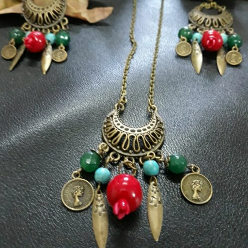 نیم ست دستساز سنتی جنس برنزی به همراه آویزهای انار سنگ یشم و فیروزه یراقهای برنزی