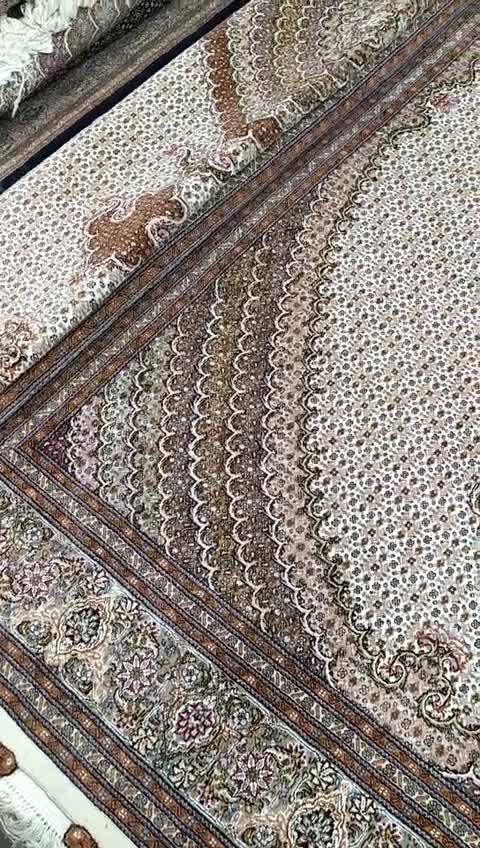 لطفاً جهت استعلام موجودی تماس بگیرید اندازه جفت 9 متری به هم چسبیده 40 رج با پشم مرینوس پرویزیان طرح گل 50 رج تک گره ترکی (تضمینی) رنگ متن کرم عاجی، حاشیه افسری و ترنج پیازی 15 متن رنگی 28 رنگ پشم و 3 رنگ ابریشم رنگرزی شده توسط دستگاه اشلاپ فورس با پودر صیبای آلمانی تضمین کیفیت بافت و رنگ همراه با قید در فاکتور