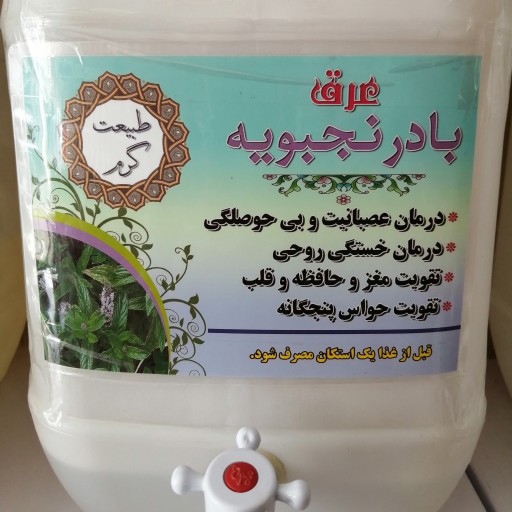 عرق بادرنجبویه محصول همدان در بطری های یک لیتری و در کارگاه کاملا بهداشتی و سنتی تقطیر شده