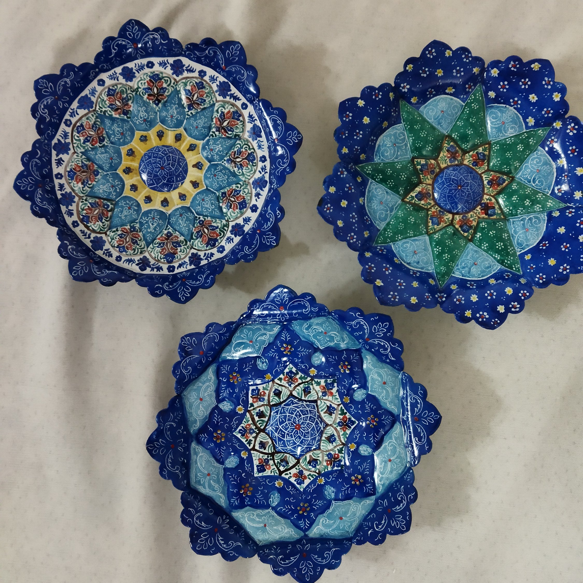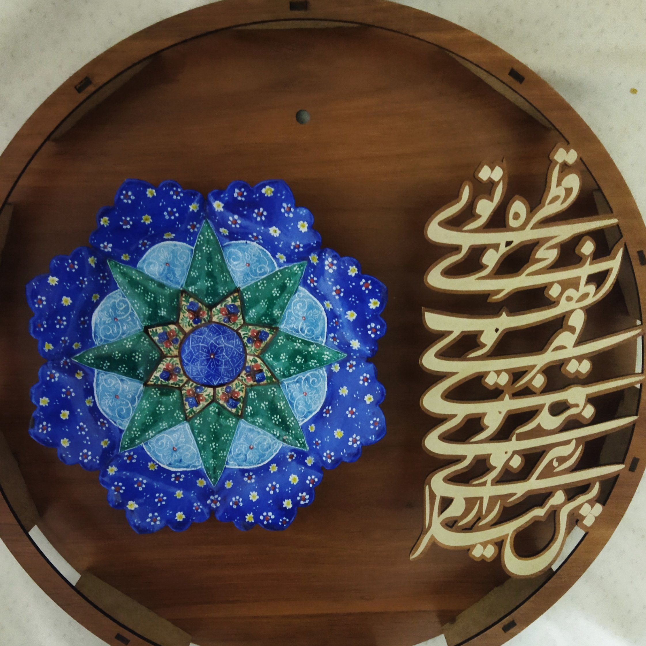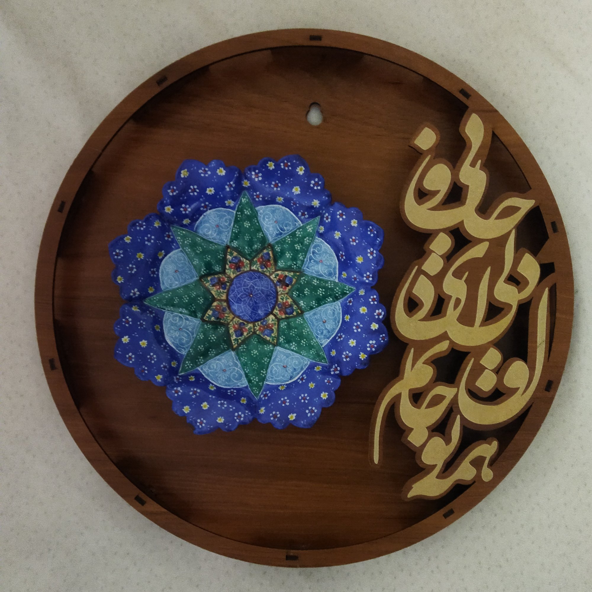 قاب چوبی مشبک با قطر 30سانت وبشقاب مینا کاری از جنس مس به قطر 16سانت میباشد طرح ها به صورت رندوم میباشد